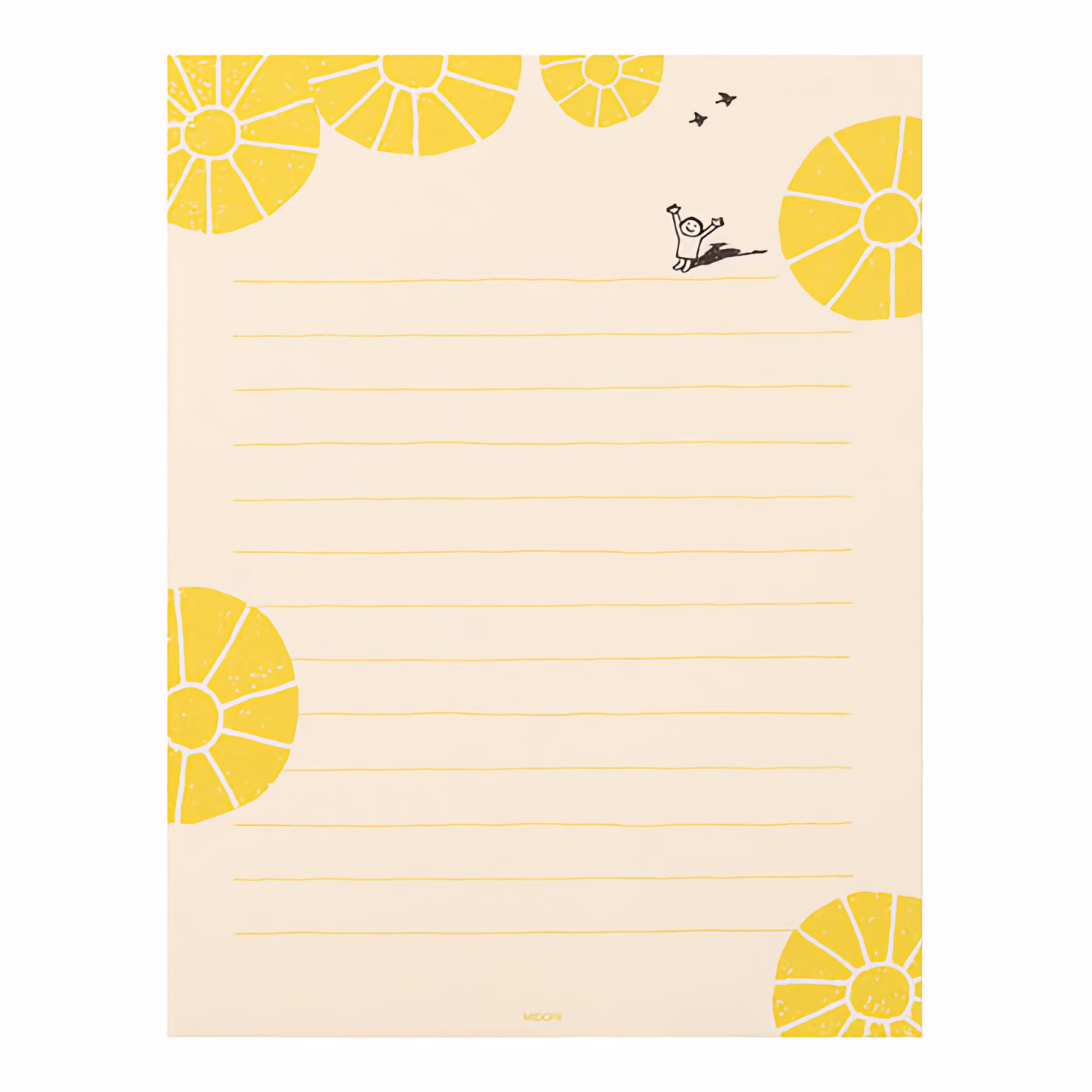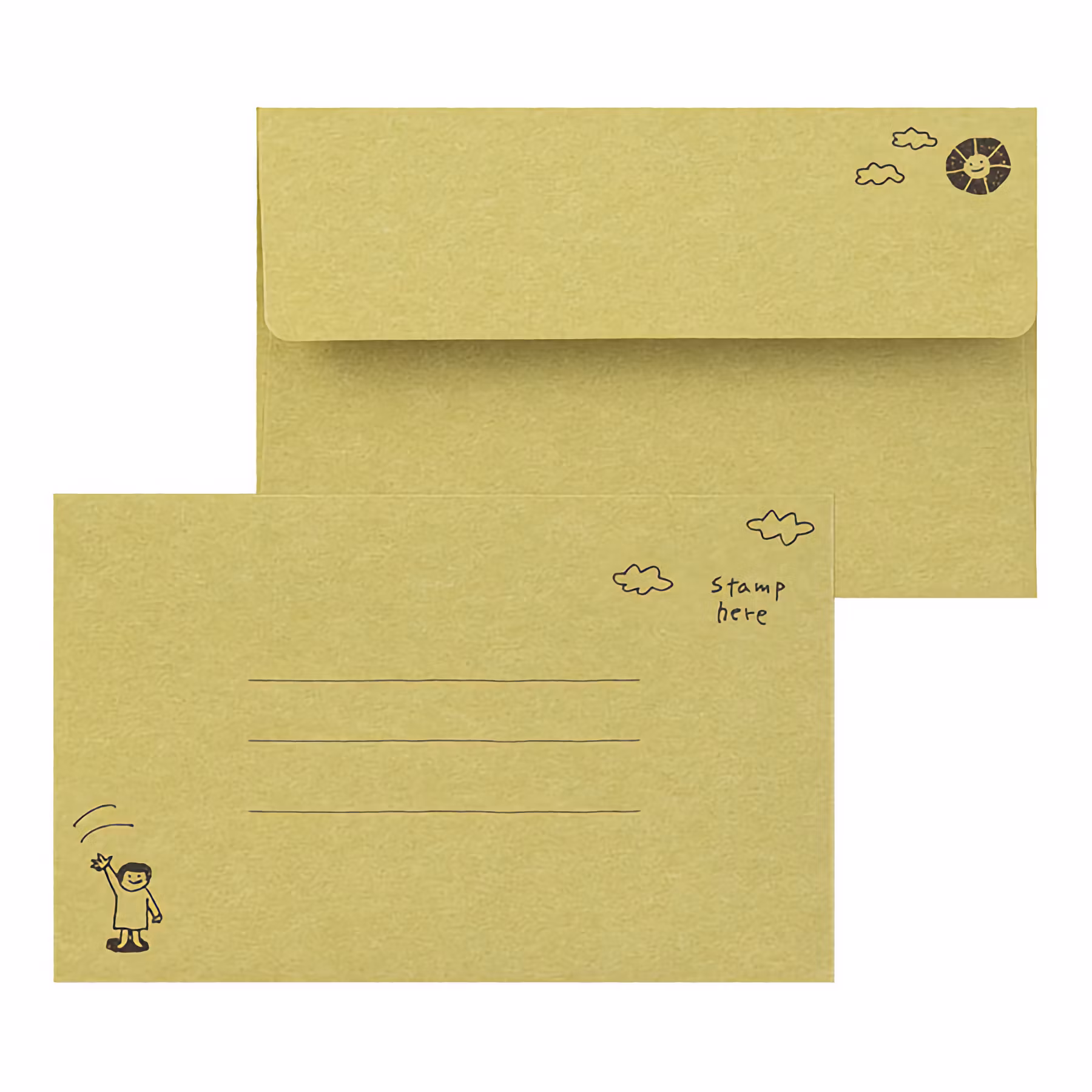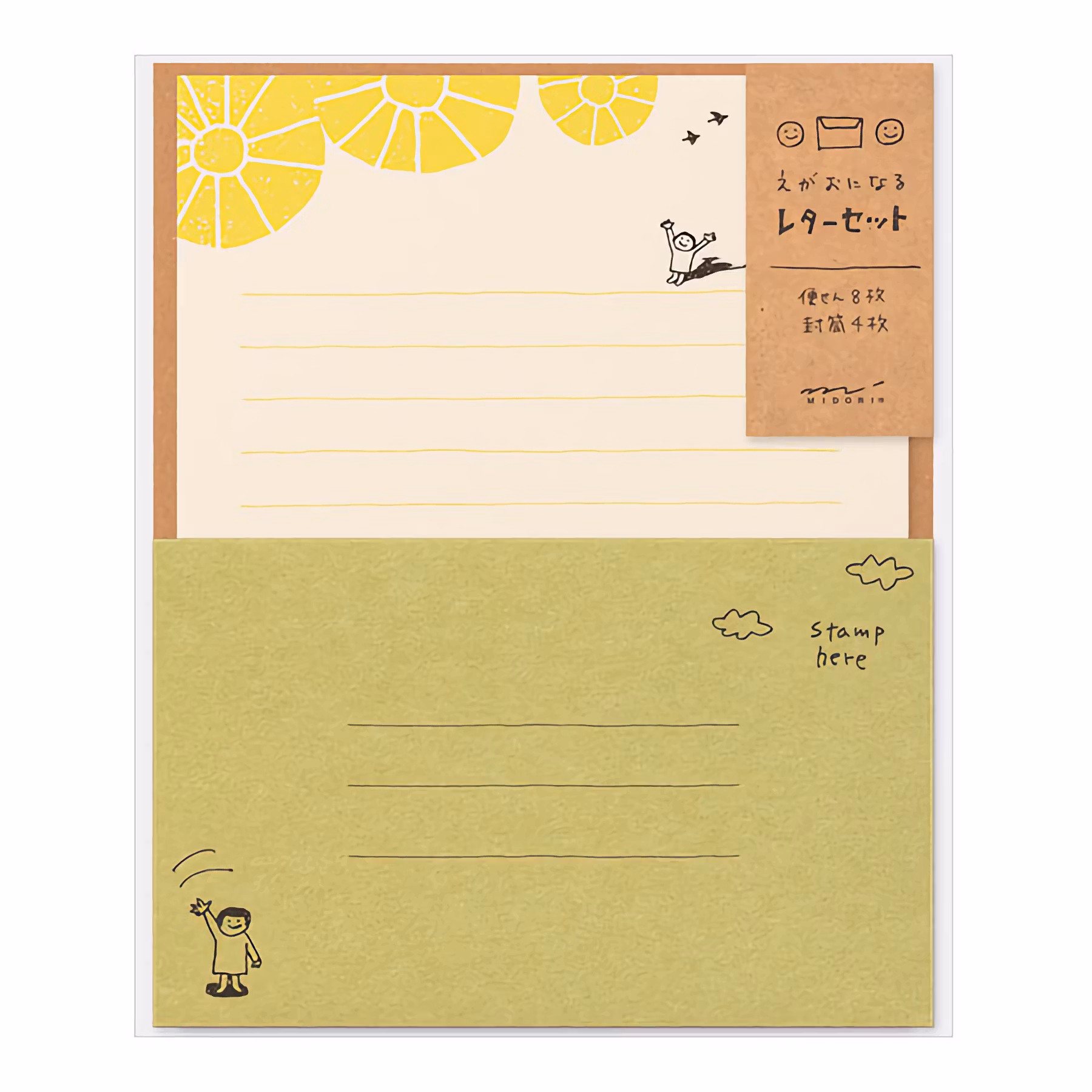 Att få ett brev är något alldeles speciellt, särskilt när både pappret och kuvertet kommer från Midori. Det här settet är illustrerad med en härlig solhälsande karatär.