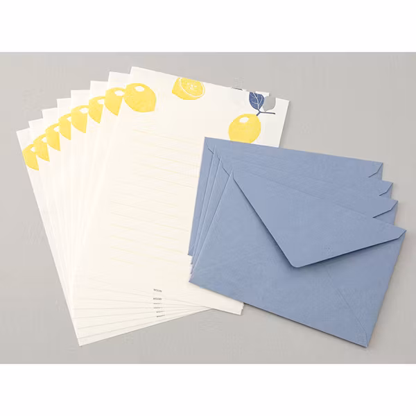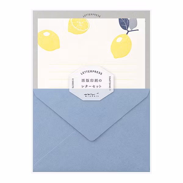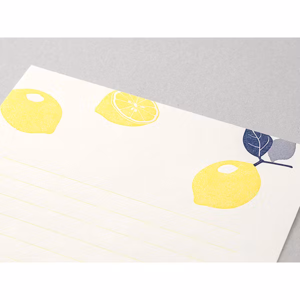 De här brevpappren från Midori är något alldeles extra. Det klassiska citron-motivet är tryckt med letterpress – på svenska kallat boktryck – vilket innebär att trycket blir både taktilt och exklusivt. Tekniken kräver stor noggrannhet, och innebär att en upphöjd infärgad yta pressas mot varje papper, vilket alltså bidrar till det taktila trycket. Både citronerna och linjerna är tryckta på det här sättet.