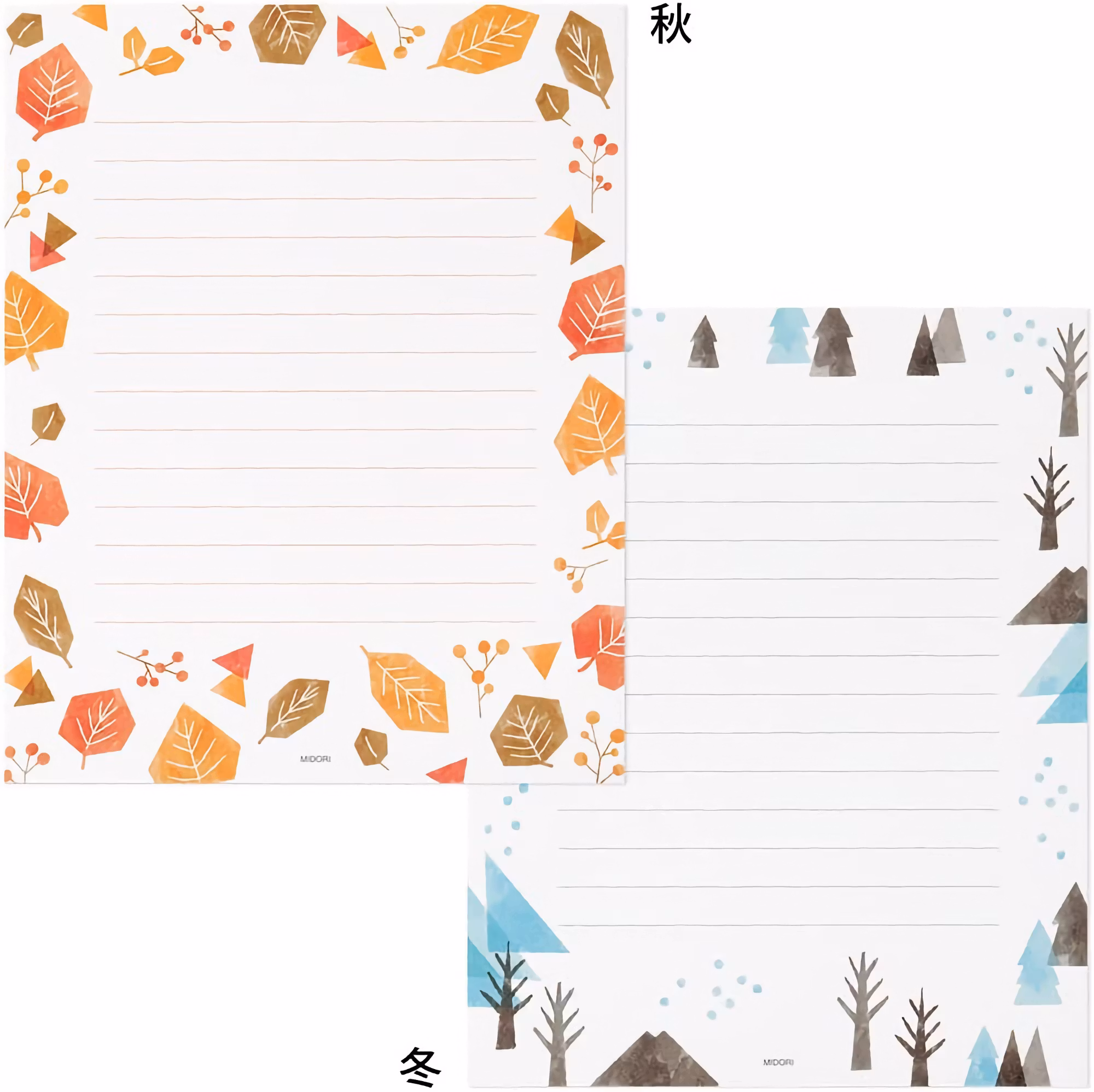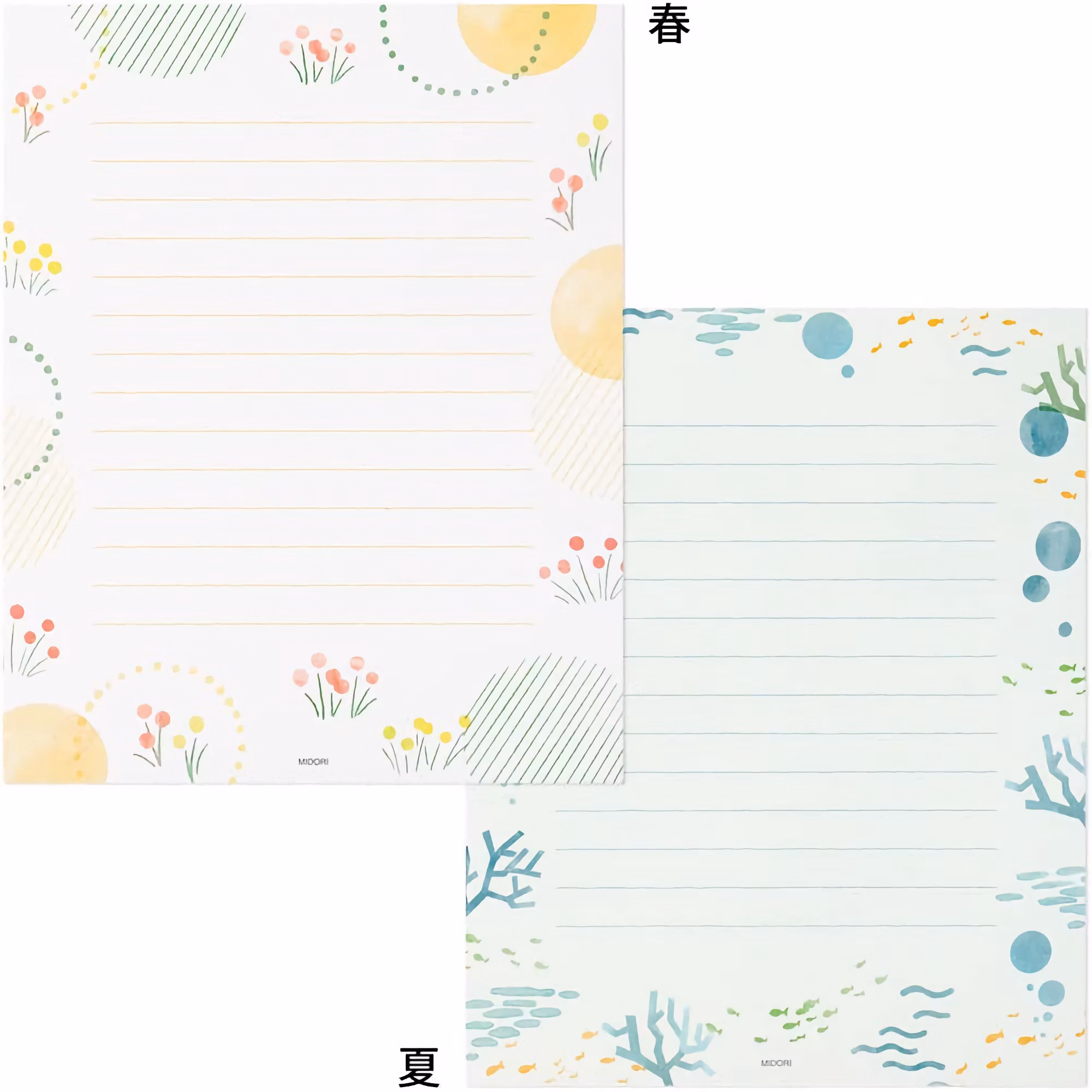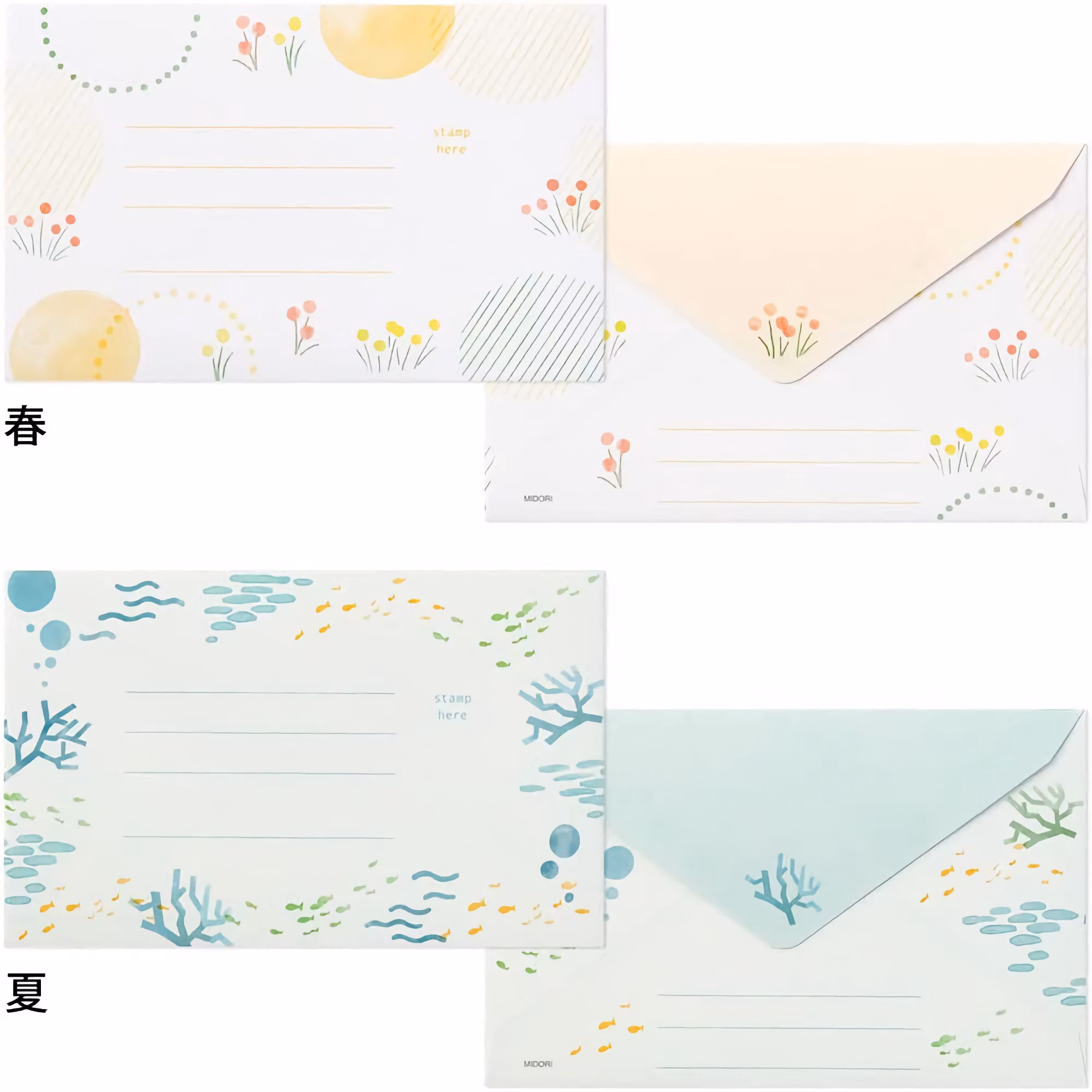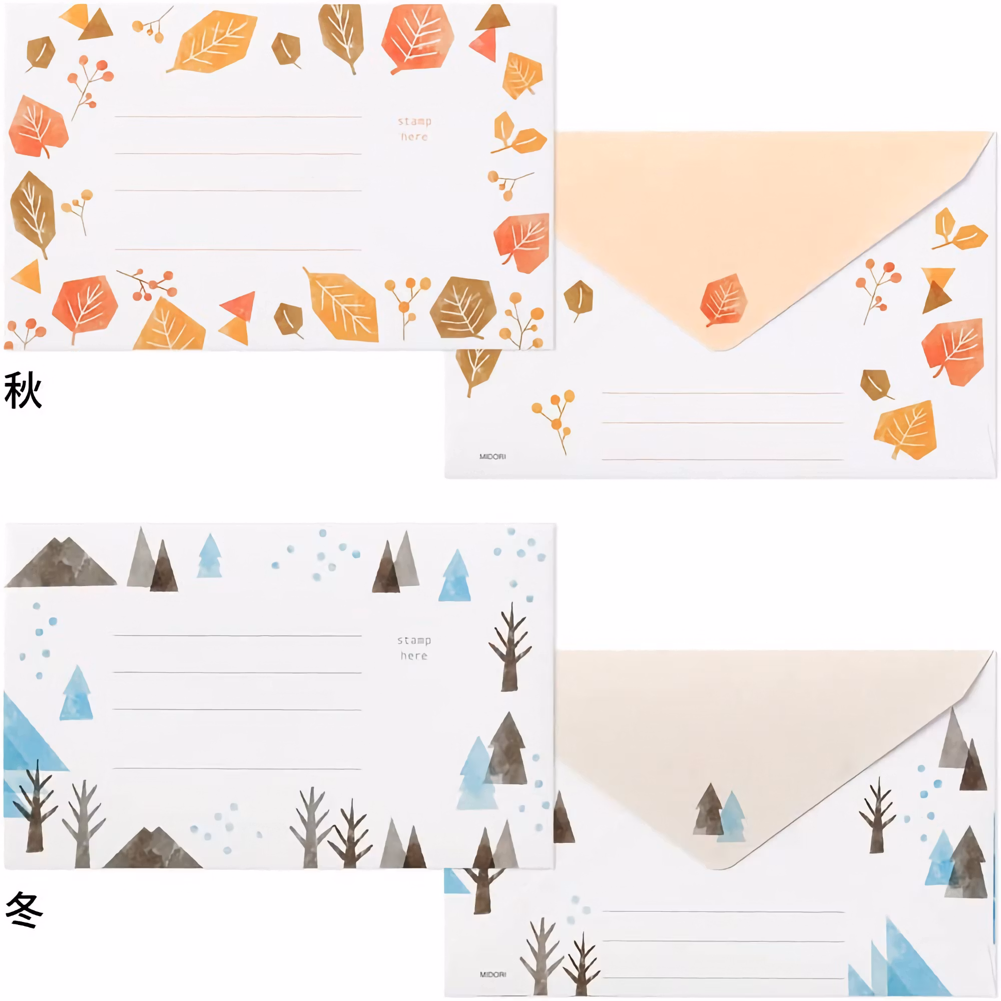 Midoris säsongsbetonade brevuppsättning med 4 olika brevpapper med tillhörande kuvert. Paketet innehåller 24 ark brevpapper (4 mönster x 6 ark), liksom 12 kuvert (4 mönster x 3 kuvert).