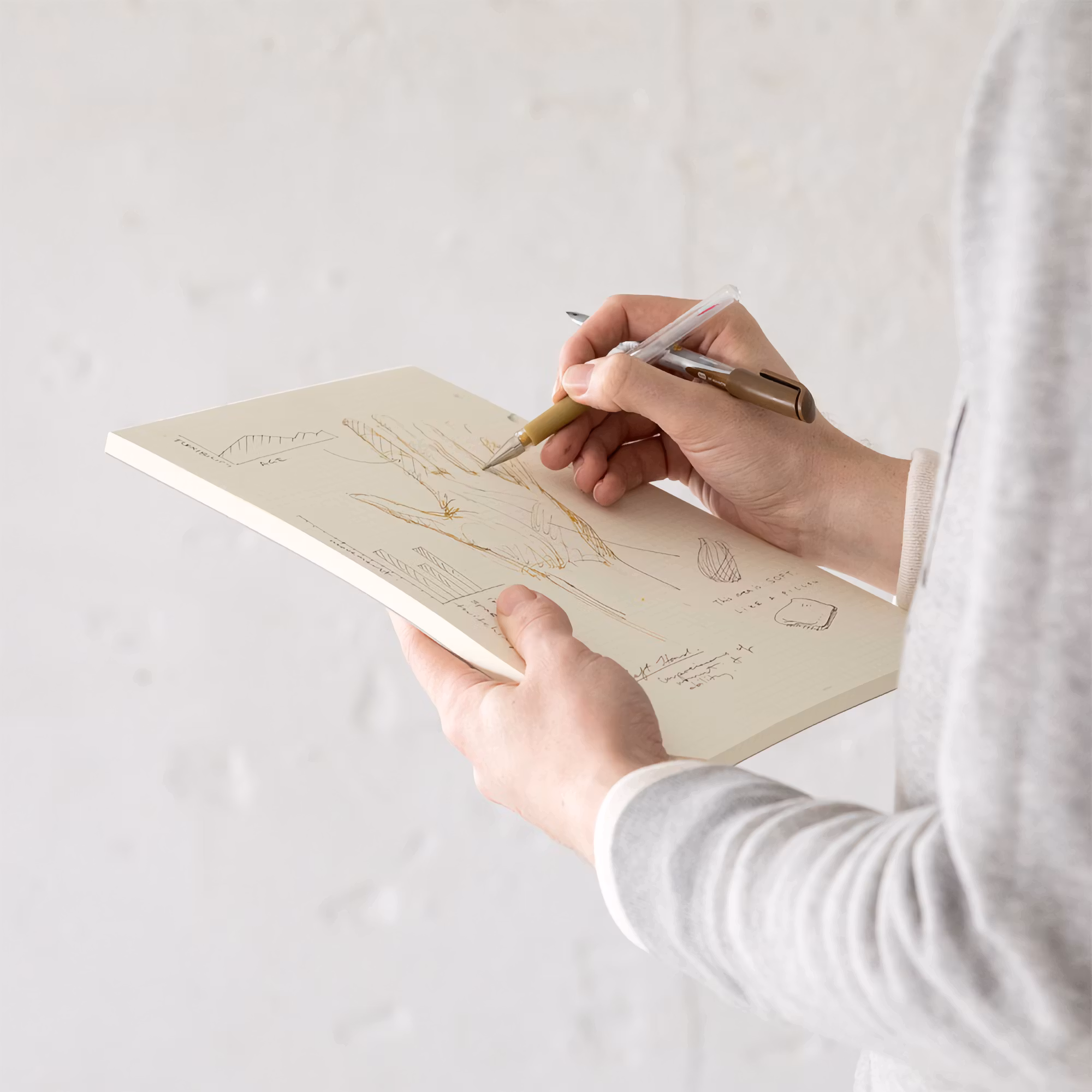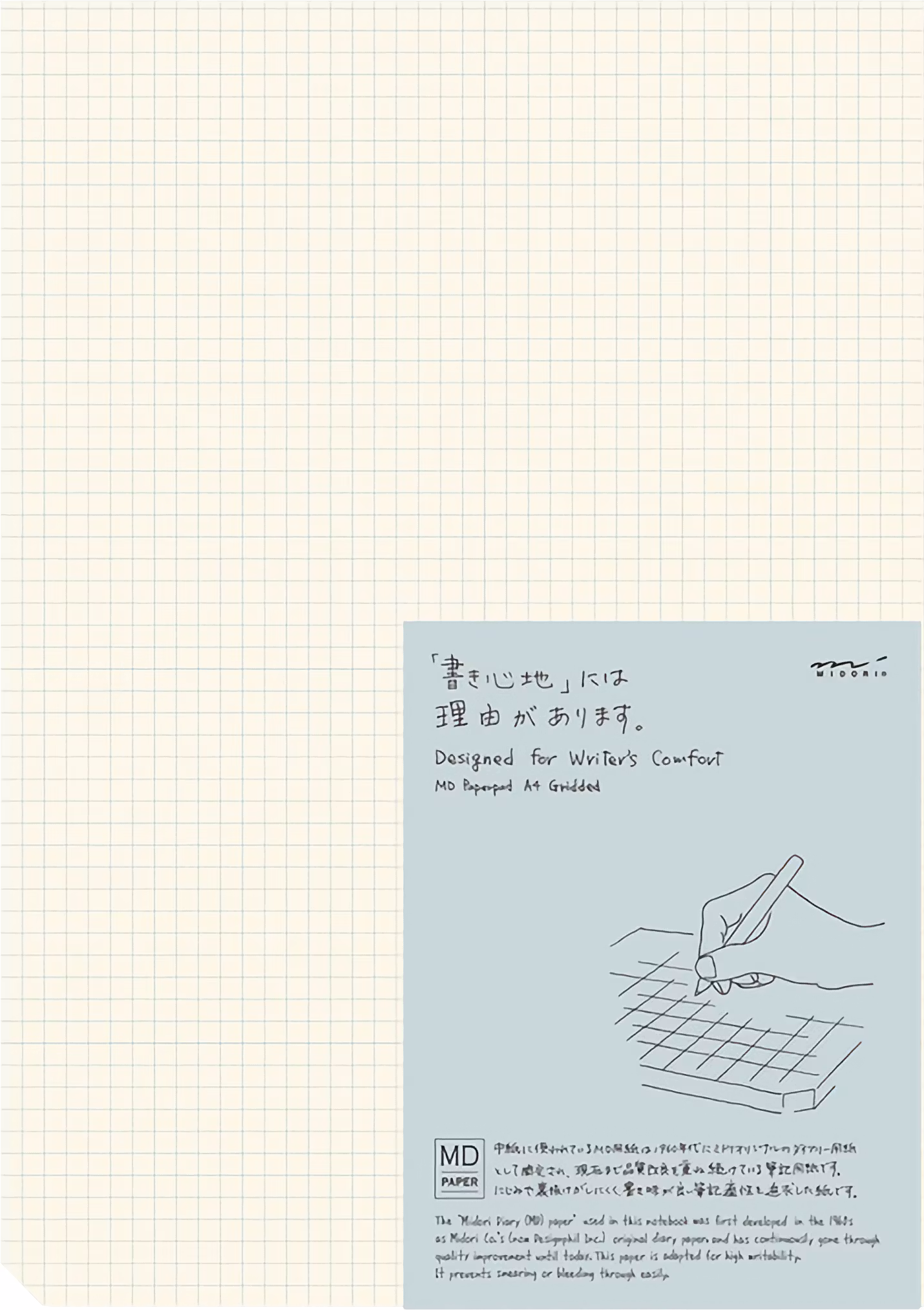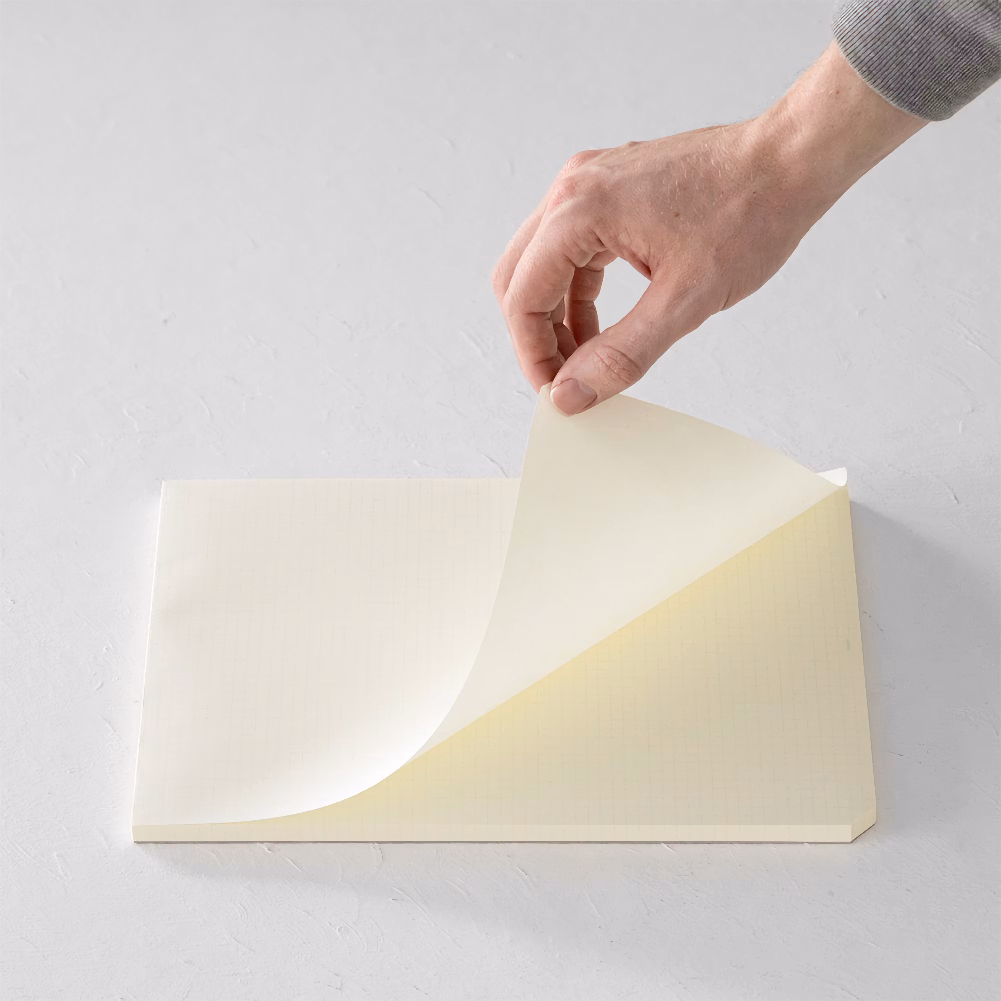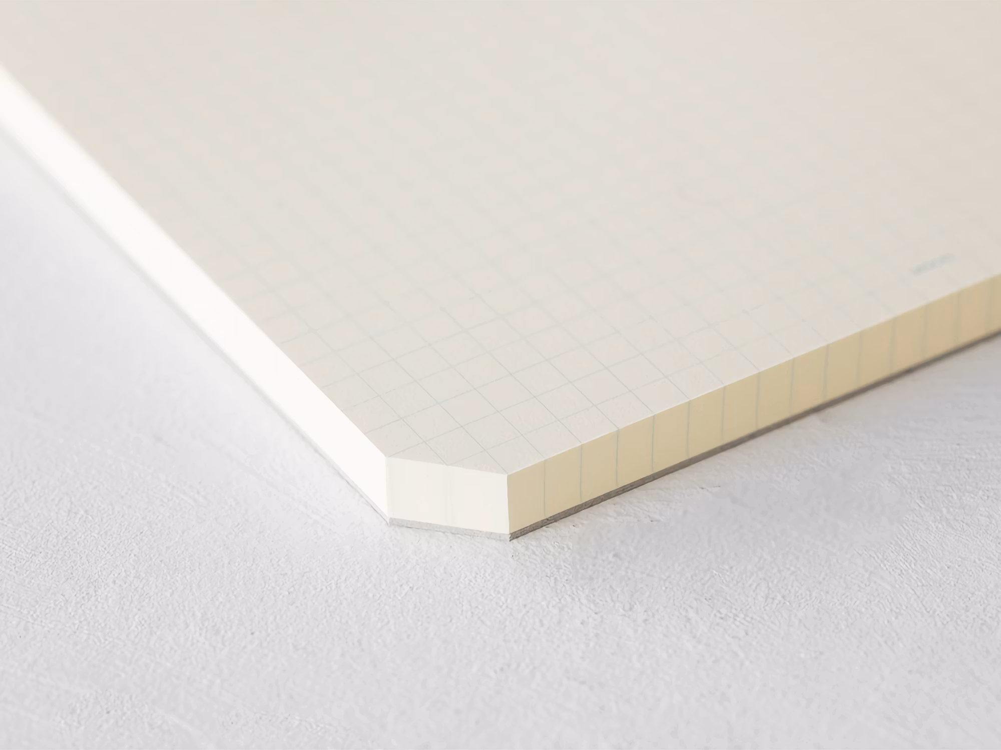 Det här pappersblocket med Midoris fantastiska MD Paper är limmat både på kort- och långsidan, vilket – tillsammans med den tjocka underliggande skivan – gör det extra stadigt. Den unika limningen underlättar också för anteckningar även i liggande format. Och – icke att förglömma(!) – det möjliggör också att du kan göra anteckningar ståendes.