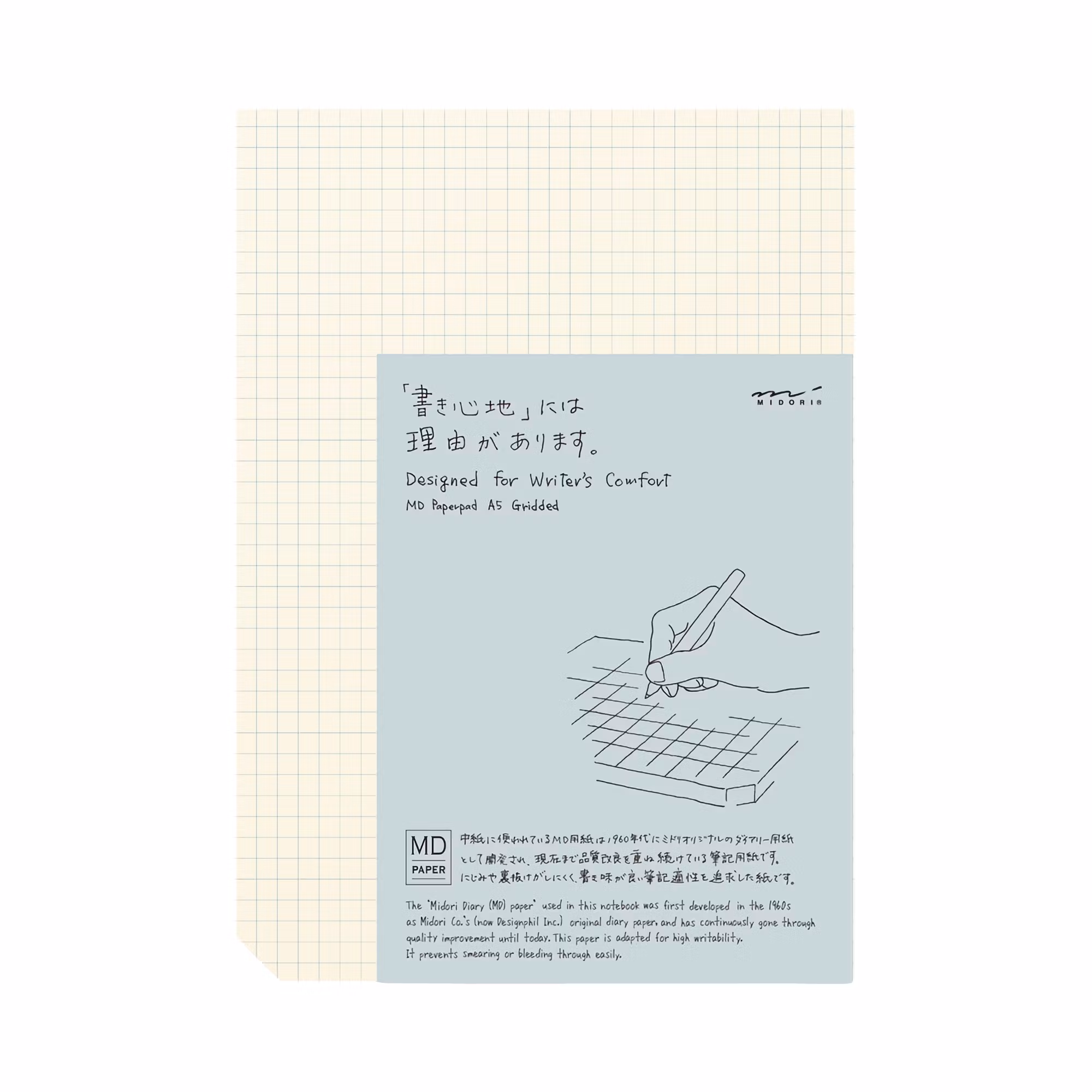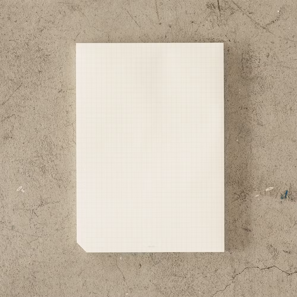Det här pappersblocket med Midoris fantastiska MD Paper är limmat både på kort- och långsidan, vilket – tillsammans med den tjocka underliggande skivan – gör det extra stadigt. Den unika limningen underlättar också för anteckningar även i liggande format. Och – icke att förglömma(!) – det möjliggör också att du kan göra anteckningar ståendes.