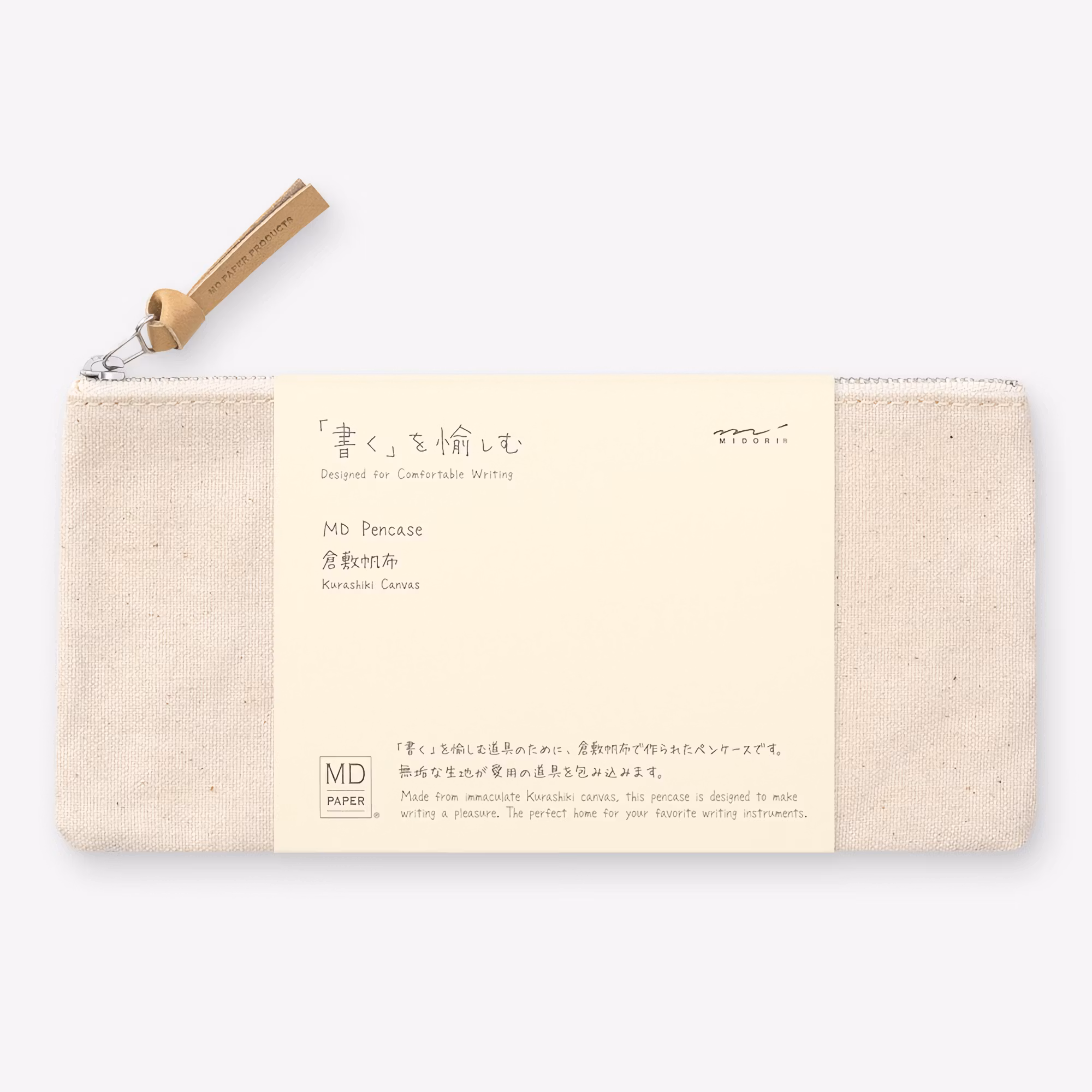 Den nakna och rena Kurashiki-kanvasen gör att MD Pencase Kurashiki Canvas andas Midori på alldeles speciellt sätt. Tyget är behandlat med vax för att stöta bort vatten, och samtidigt ge det en särskild styvhet som mjuknar och låter sig formas ju mer du använder det. Utöver det stora facket har fodralet även en liten ficka, perfekt för bläckpatroner eller suddgummin.