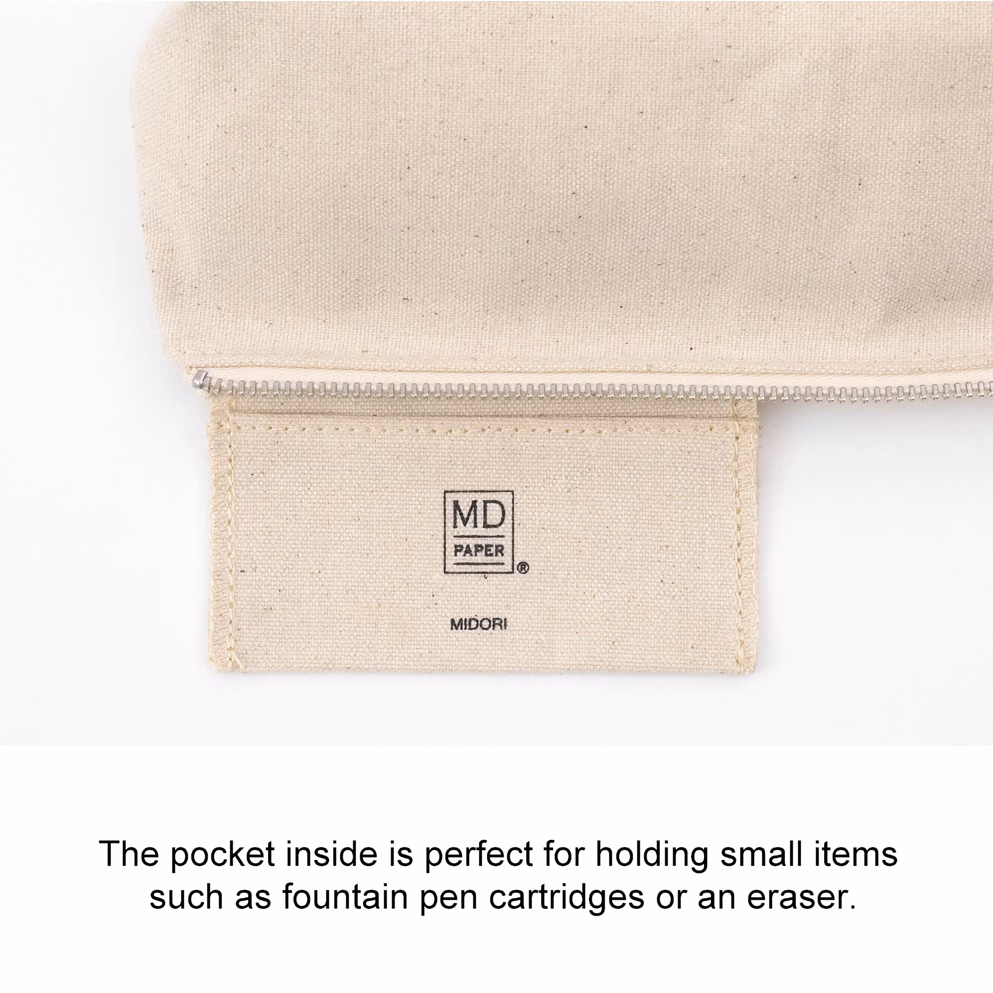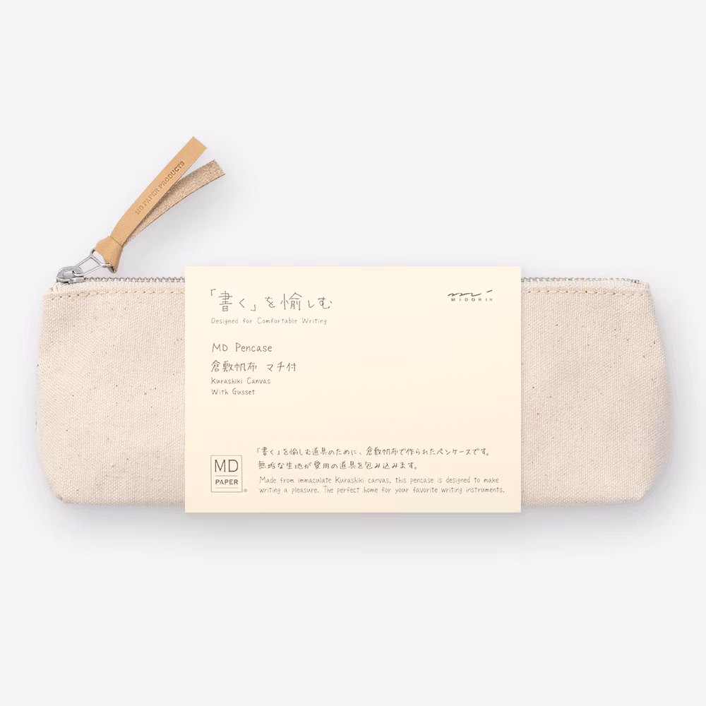 Den nakna och rena Kurashiki-kanvasen gör att MD Pencase Kurashiki Canvas andas Midori på alldeles speciellt sätt. Tyget är behandlat med vax för att stöta bort vatten, och samtidigt ge det en särskild styvhet som mjuknar och låter sig formas ju mer du använder det. Utöver det stora facket har fodralet även en liten ficka, perfekt för bläckpatroner eller suddgummin.