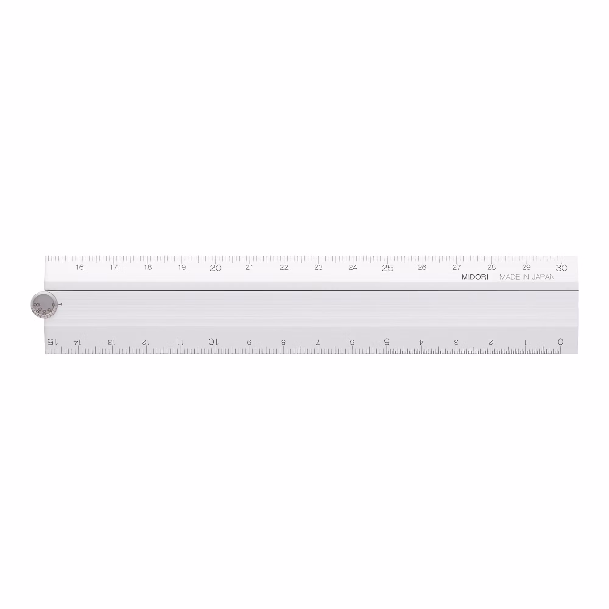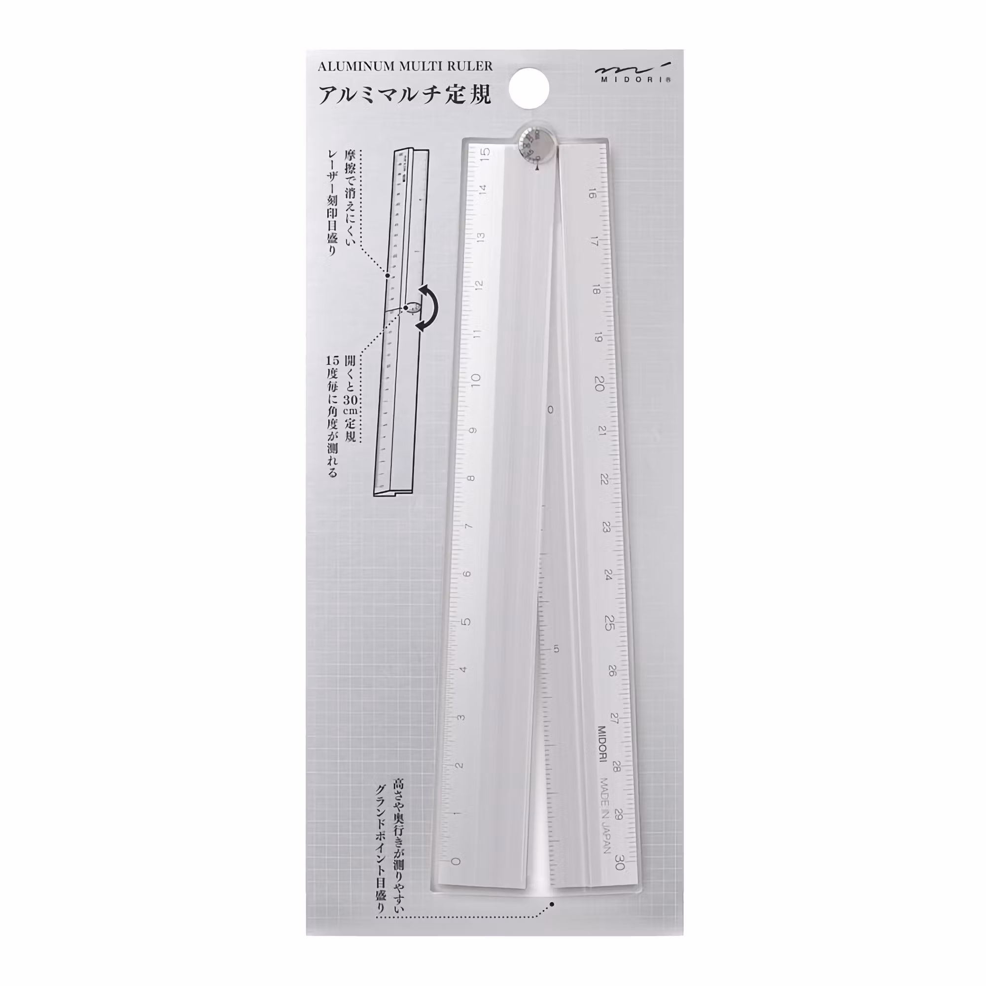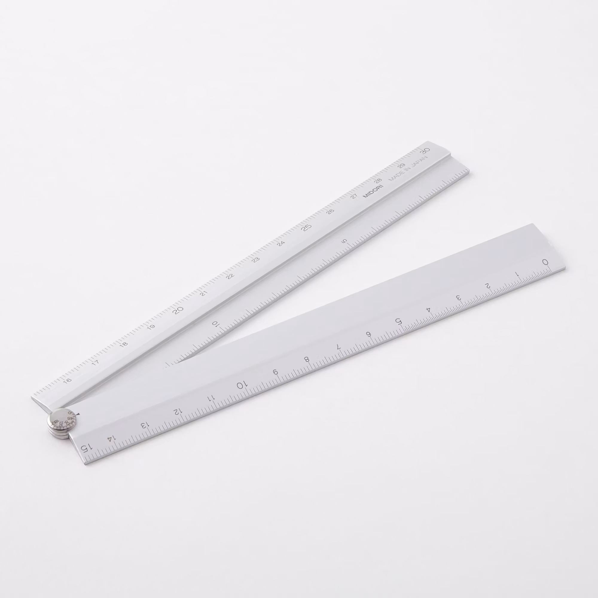 Midoris linjal är briljant. Fullt expanderad mäter (ursäkta ordvitsen) linjalen 30 cm. Men det riktigt finurliga inträffar först när du mätt klart, då du helt sonika bara viker ihop den på hälften och stoppar den i exempelvis ett pennfodral. När du sedan vill använda den igen viker du bara ut den, varpå de två delarna knäpps ihop så att du utan problem kan rita långa räta linjer. Linjalen är tillverkad av tålig aluminium, vilket underlättar vid användning av exempelvis hantverks- eller pappersknivar. Millimetermärkena är lasergraverade, vilket innebär att de inte kommer att blekna med tiden. En av linjalens sidor har nollsträcket precis vid kanten, så att du kan hålla linjalens kant direkt mot vad du önskar mäta. Linjalen fungerar också som en gradskiva, med fästmärken vid varje 15 grader.