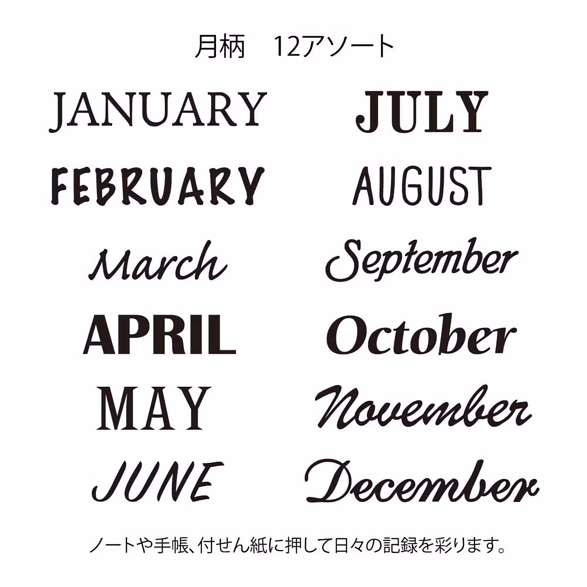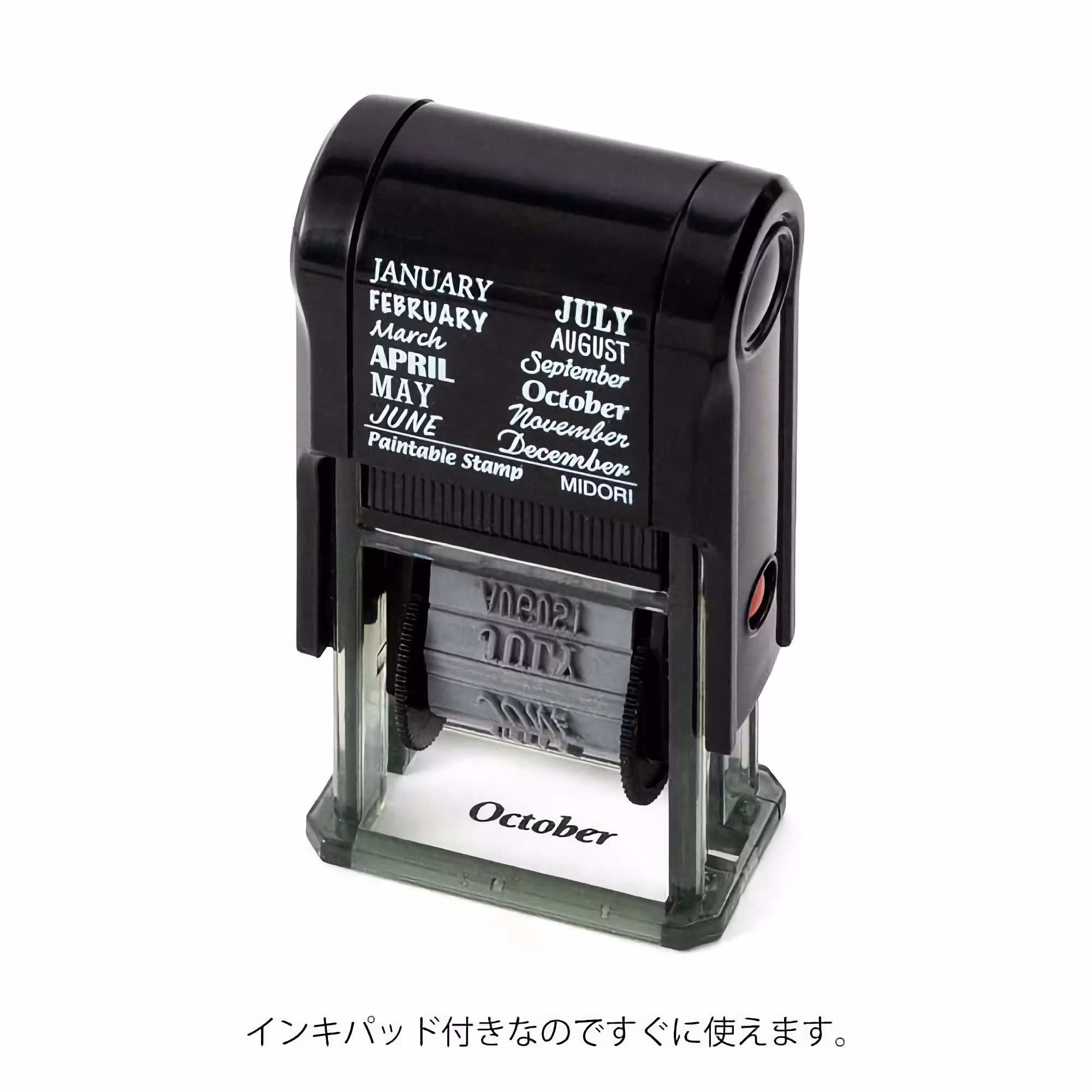 Med den här geniala stämpeln från Midori kan du lätt stämpla dit namnet på månaderna varhelst du vill. Det oljebaserade bläcket kladdar inte, och möjliggör att du kan fylla i mönstret med en vattenbaserad märkpenna, som exempelvis Midori Colorpens For Paintable Stamps..