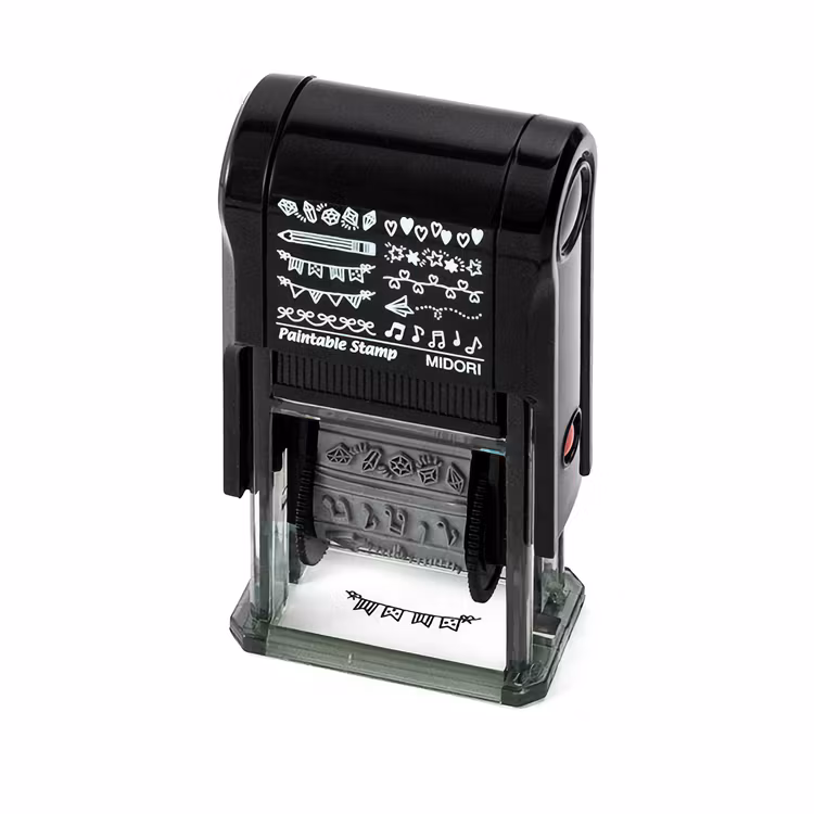 Med den här geniala stämpeln från Midori kan du lätt dekorera med olika motiv, så som flaggor, hjärtan och pennor. Det oljebaserade bläcket kladdar inte, och möjliggör att du kan fylla i mönstret med en vattenbaserad märkpenna, som exempelvis Midori Colorpens For Paintable Stamps.