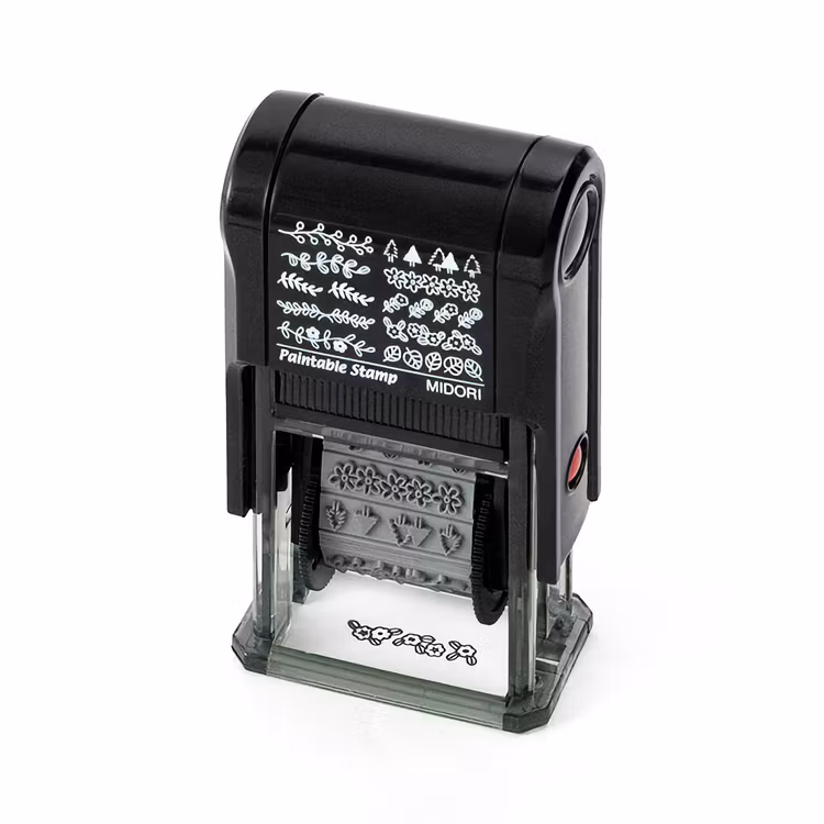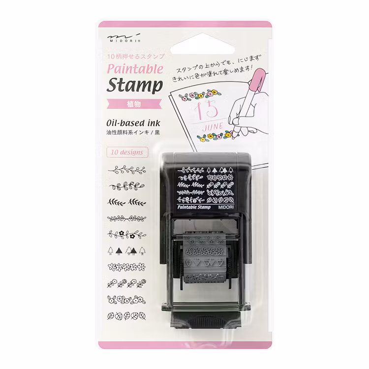 Med den här geniala stämpeln från Midori kan du lätt dekorera med växter och blad. Det oljebaserade bläcket kladdar inte, och möjliggör att du kan fylla i mönstret med en vattenbaserad märkpenna, som exempelvis Midori Colorpens For Paintable Stamps.