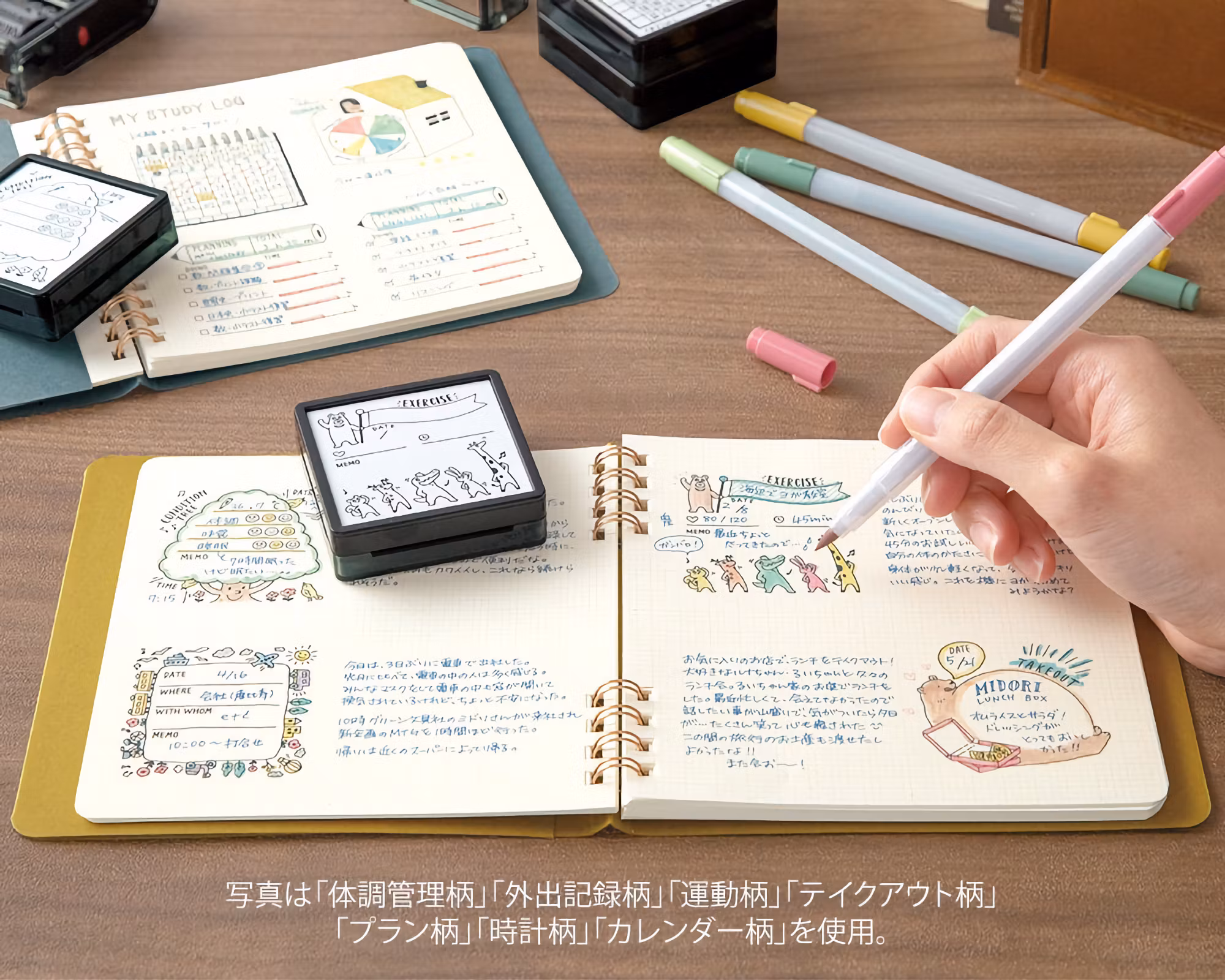 Midoris stämplar är perfekta att användas i din kalender, bullet journal eller anteckningsbok. Det oljebaserade bläcket kladdar inte, och möjliggör att du kan fylla i mönstret med en penna. Bläcket – som redan är påfyllt – räcker ungefär 1000 gånger. Efter detta går det givetvis bra att fylla på mer bläck. Kan staplas för lättare förvaring.