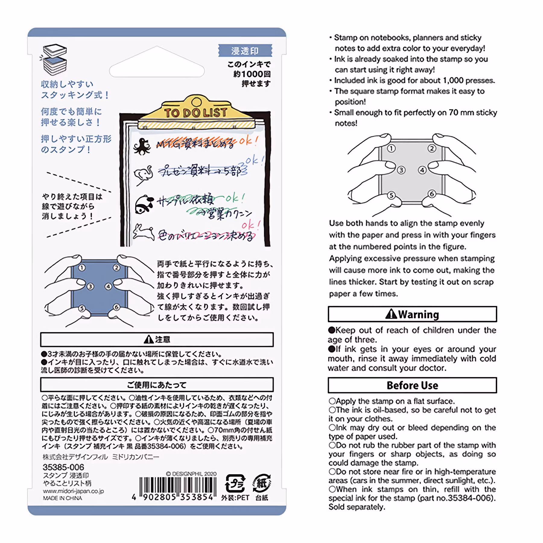 Midoris stämplar är perfekta att användas i din kalender, bullet journal eller anteckningsbok. Det oljebaserade bläcket kladdar inte, och möjliggör att du kan fylla i mönstret med en penna. Bläcket – som redan är påfyllt – räcker ungefär 1000 gånger. Efter detta går det givetvis bra att fylla på mer bläck. Kan staplas för lättare förvaring.