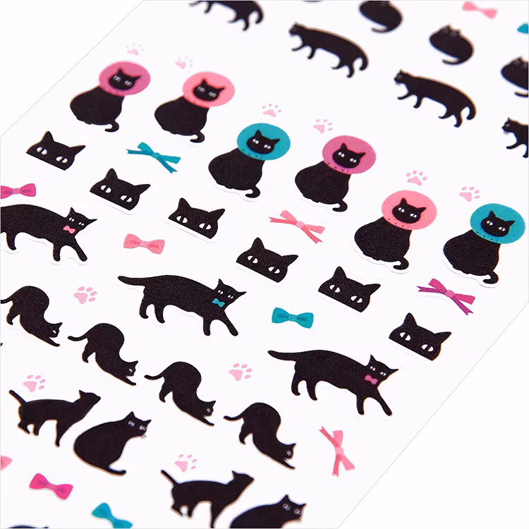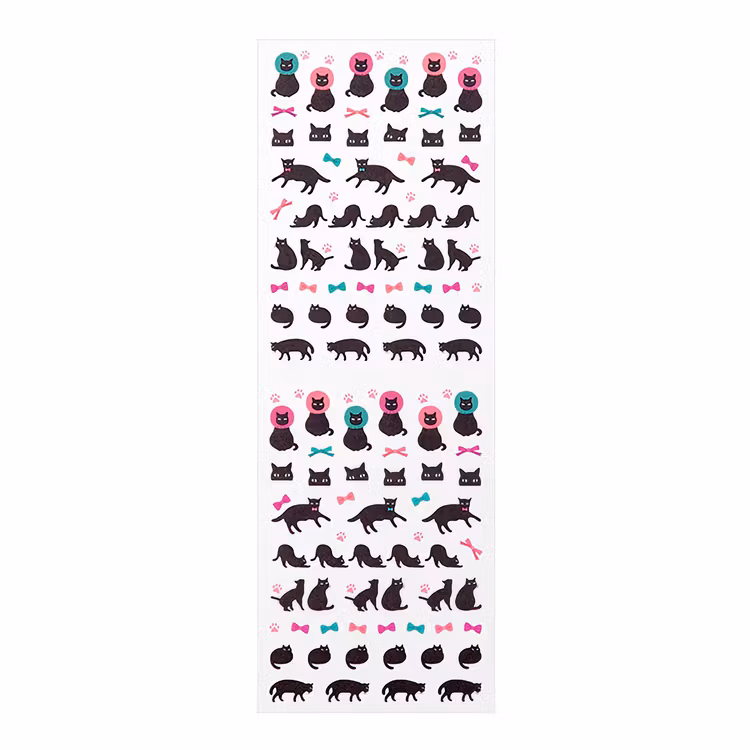 I Japan betyder en svart katt inte otur – snarare tvärtom – de anses till och med kunna locka till sig friare! Midoris urgulliga klistermärken livar verkligen upp, vare sig det är i kalendern eller i anteckningar eller brev. Arket har en perforering vilket gör att du kan dela det i två för att lättare kunna förvara eller dela med dig av dem.