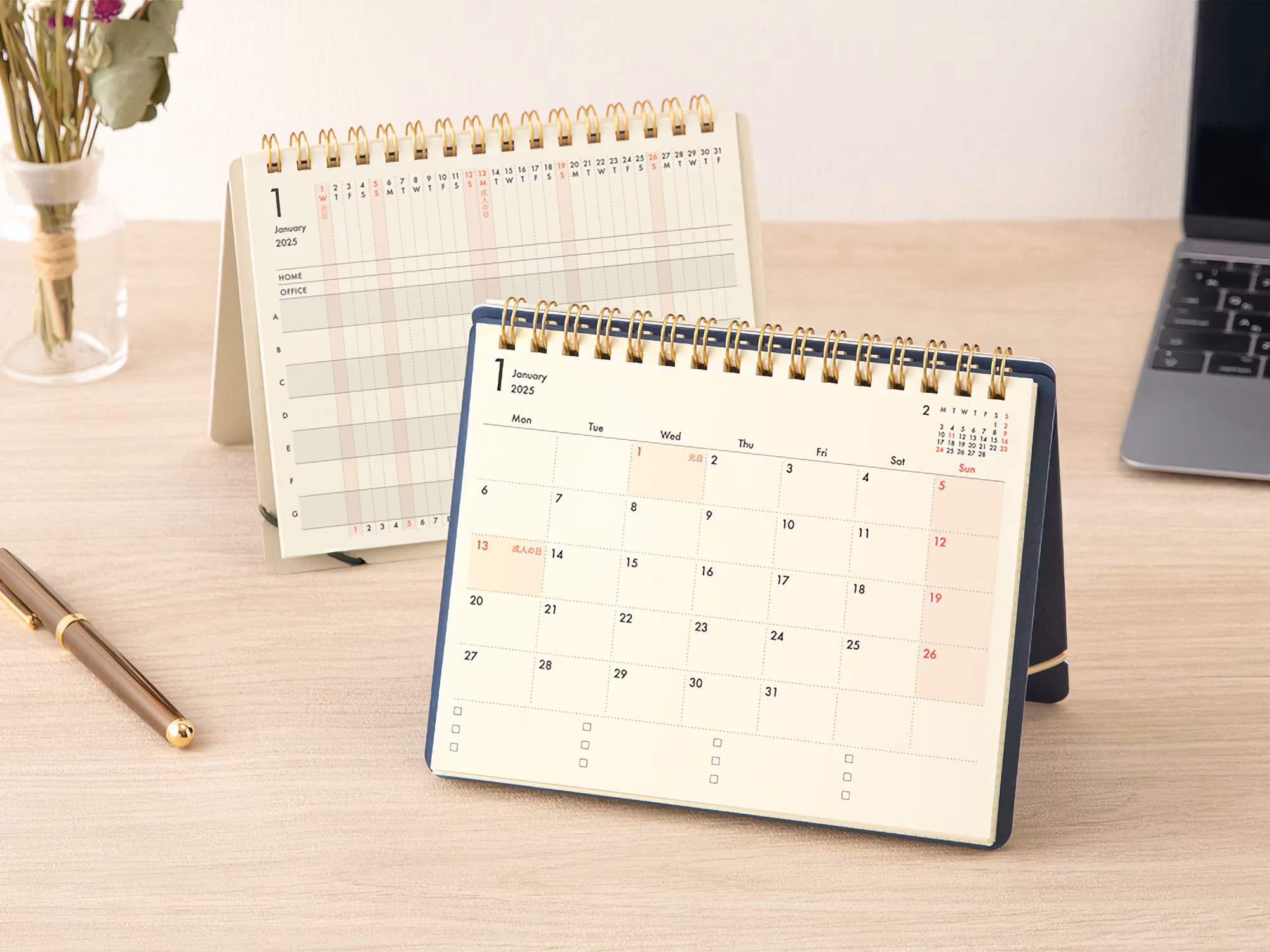 Den här smarta kalendern kan – liksom + Stand Notebook – stå på ditt skrivbord. Dra bara gummisnodden runt hörnen på den bakre pärmen, så kan pärmarna användas som stöd.