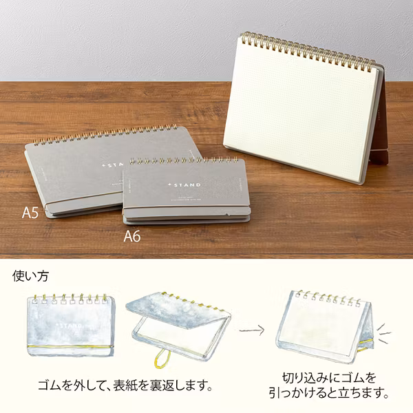 Midoris nya – stående – anteckningsbok! Med hjälp av ett gummiband kan den här anteckningsboken från japanska Midori stå på ditt skrivbord, vilket öppnar upp för en mängd möjligheter. Den här utgåvan har ett cross grid-mönster (se bild). Finns också i blankt utförande.