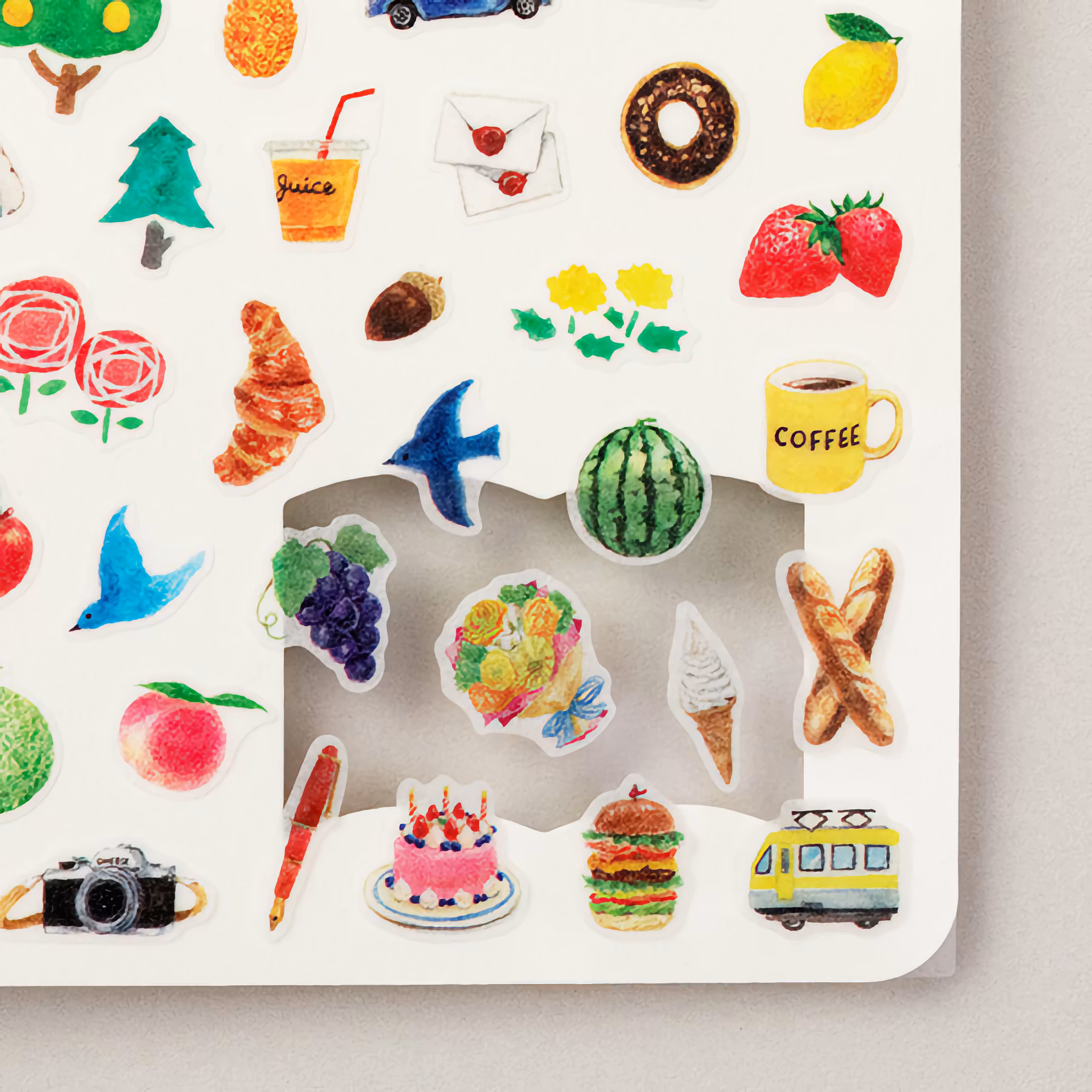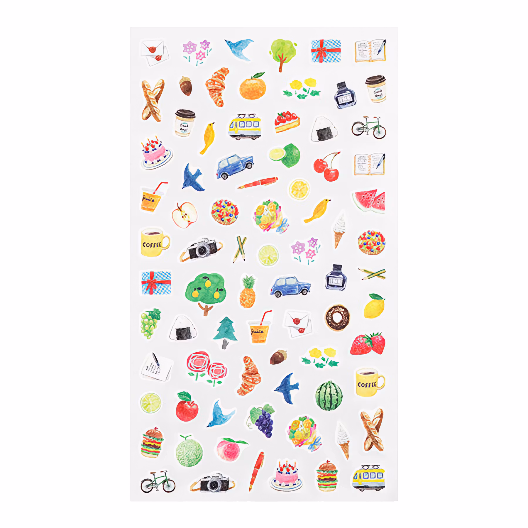 Ett ark med härliga washiklistermärken med motiv från vardagen som lätt kan klistras på och dras av för att sätta färg på din dagbok. Klistermärkena är tänkta att placeras i någon av dagböckerna i Midori Diary with Stickers-serien, men kan så klart användas överallt.