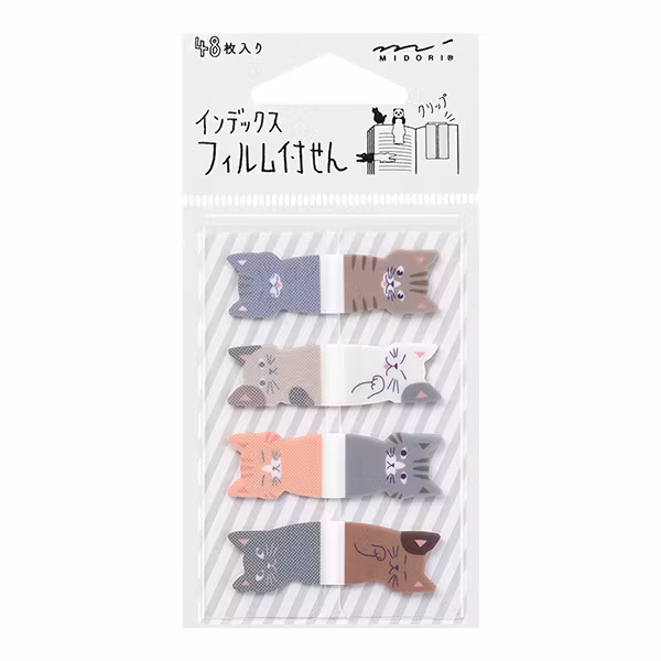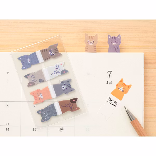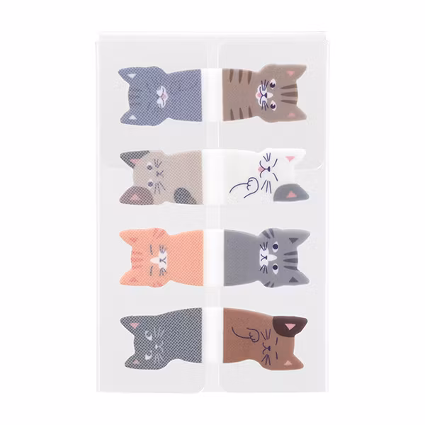 Dessa underbara katter gör det enkelt att organisera dina anteckningar eller ditt läsande! Klistermärkena täcker hälften av baksidan, medan den andra hälften är transparent för att möjliggöra och underlätta noteringar. Klistermärkena kommer med en typ av plastfodral med en klämma på baksidan, vilket gör att du kan fästa den i exempelvis en anteckningsbok. På grund av sin glansiga yta lämpar sig kulspetspennor, blyerts och permanenta märkpennor bäst för att skriva på dessa. Vattenbaserat bläck lämpar sig mindre bra.