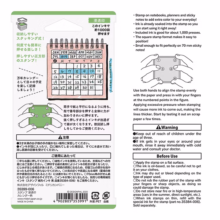 Midoris stämplar är perfekta att användas i din kalender, bullet journal eller anteckningsbok. Det oljebaserade bläcket kladdar inte, och möjliggör att du kan fylla i mönstret med en penna. Bläcket – som redan är påfyllt – räcker ungefär 1000 gånger. Efter detta går det givetvis bra att fylla på mer bläck. Kan staplas för lättare förvaring.