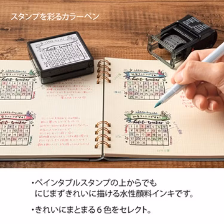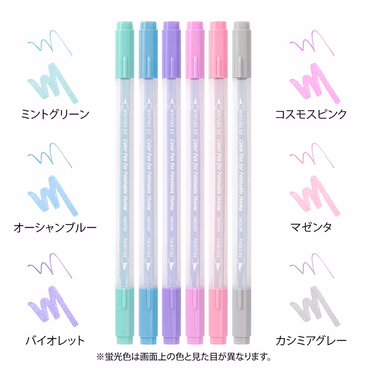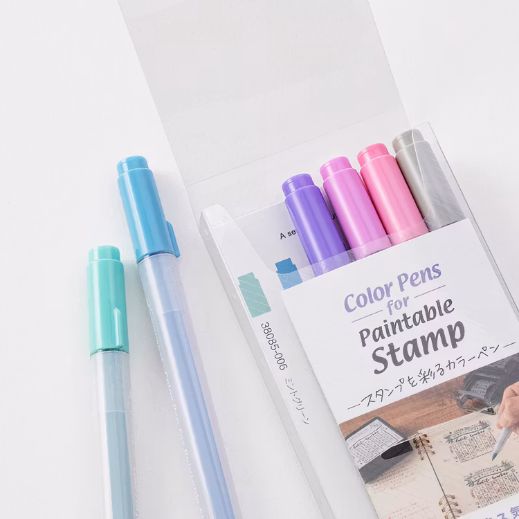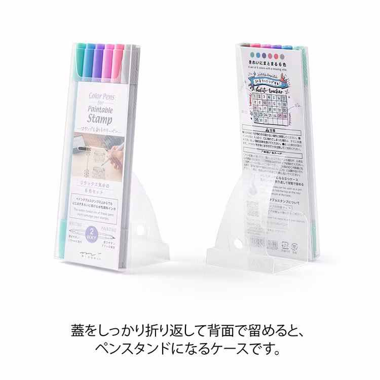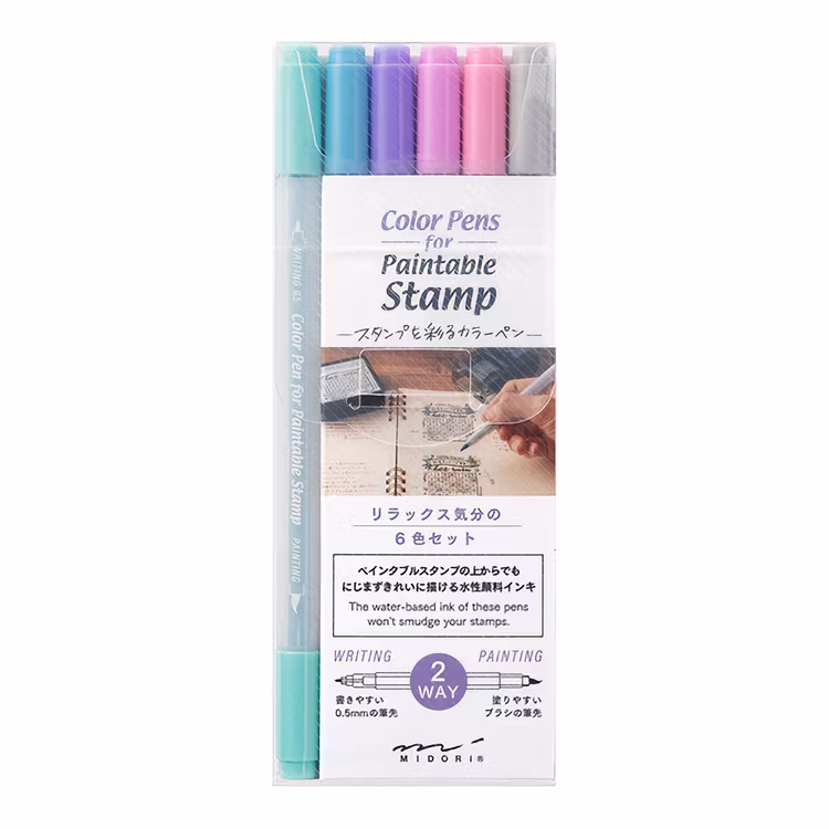 Sex härliga pennor särskilt utvecklade för att färglägga Midoris olika stämplar. Pennorna har ett vattenbaserat pigmentbläck speciellt framtaget för att inte blöda igenom. Pennorna har två olika spetsar på vardera ända: en 0,5 mm som gör det lätt att fylla i stämplarna, och en bredare spets för lättare färgläggning.