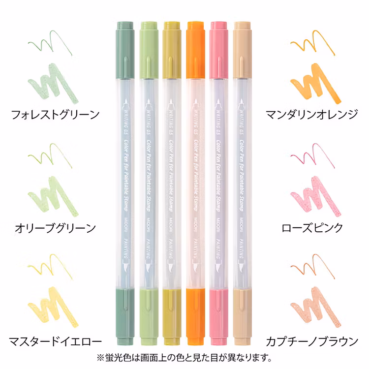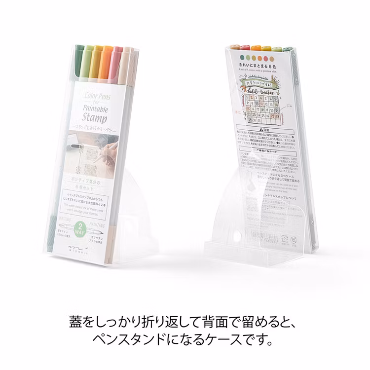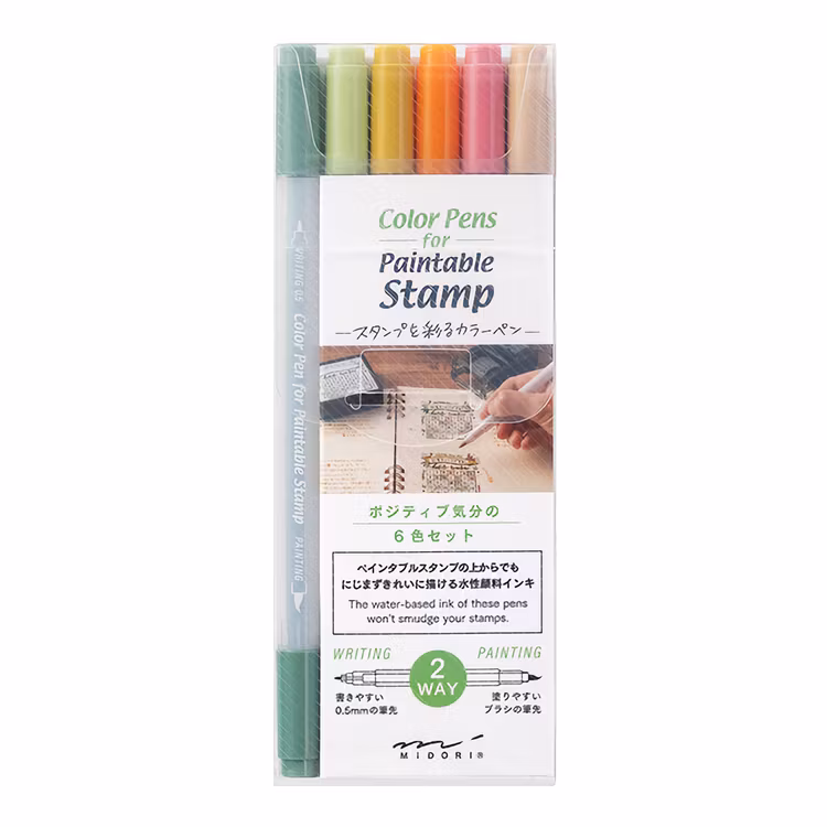 Sex härliga pennor särskilt utvecklade för att färglägga Midoris olika stämplar. Pennorna har ett vattenbaserat pigmentbläck speciellt framtaget för att inte blöda igenom. Pennorna har två olika spetsar på vardera ända: en 0,5 mm som gör det lätt att fylla i stämplarna, och en bredare spets för lättare färgläggning.