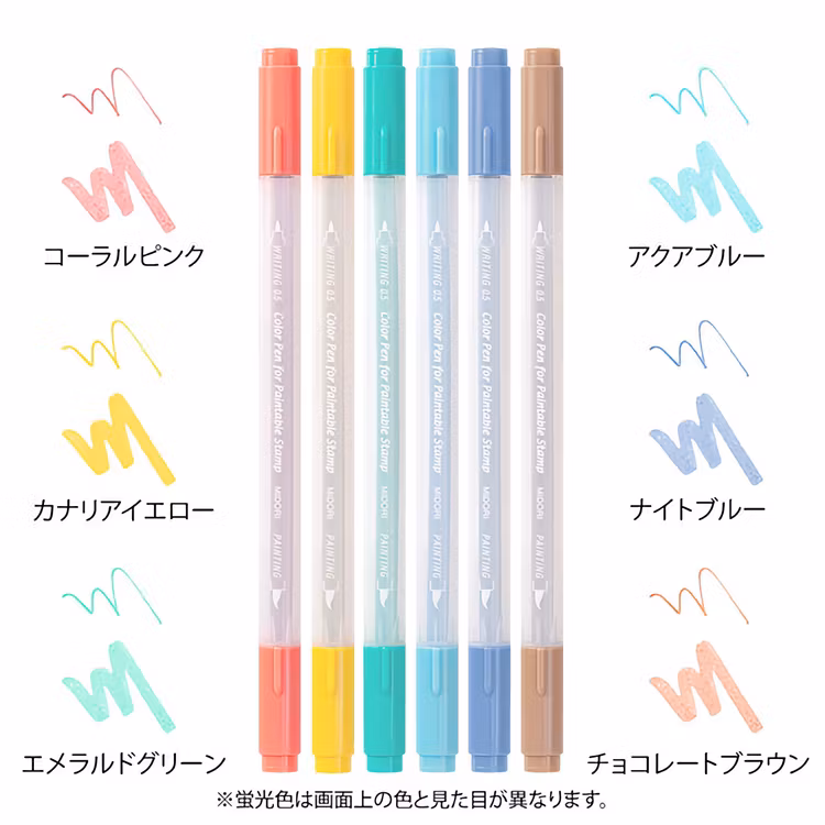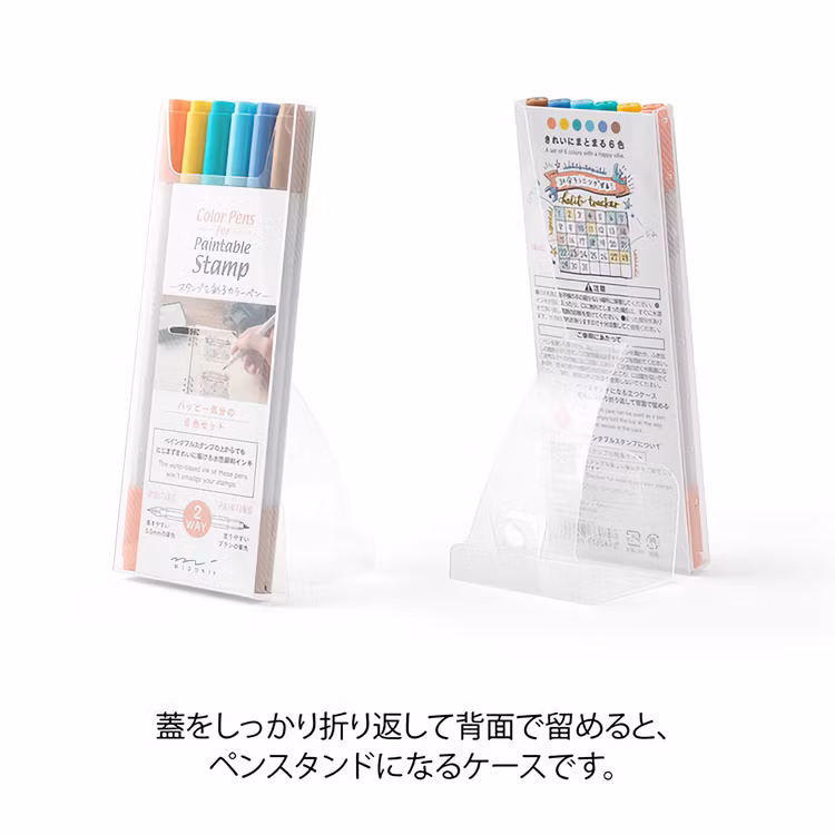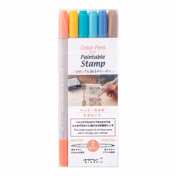 Sex härliga pennor särskilt utvecklade för att färglägga Midoris olika stämplar. Pennorna har ett vattenbaserat pigmentbläck speciellt framtaget för att inte blöda igenom. Pennorna har två olika spetsar på vardera ända: en 0,5 mm som gör det lätt att fylla i stämplarna, och en bredare spets för lättare färgläggning.