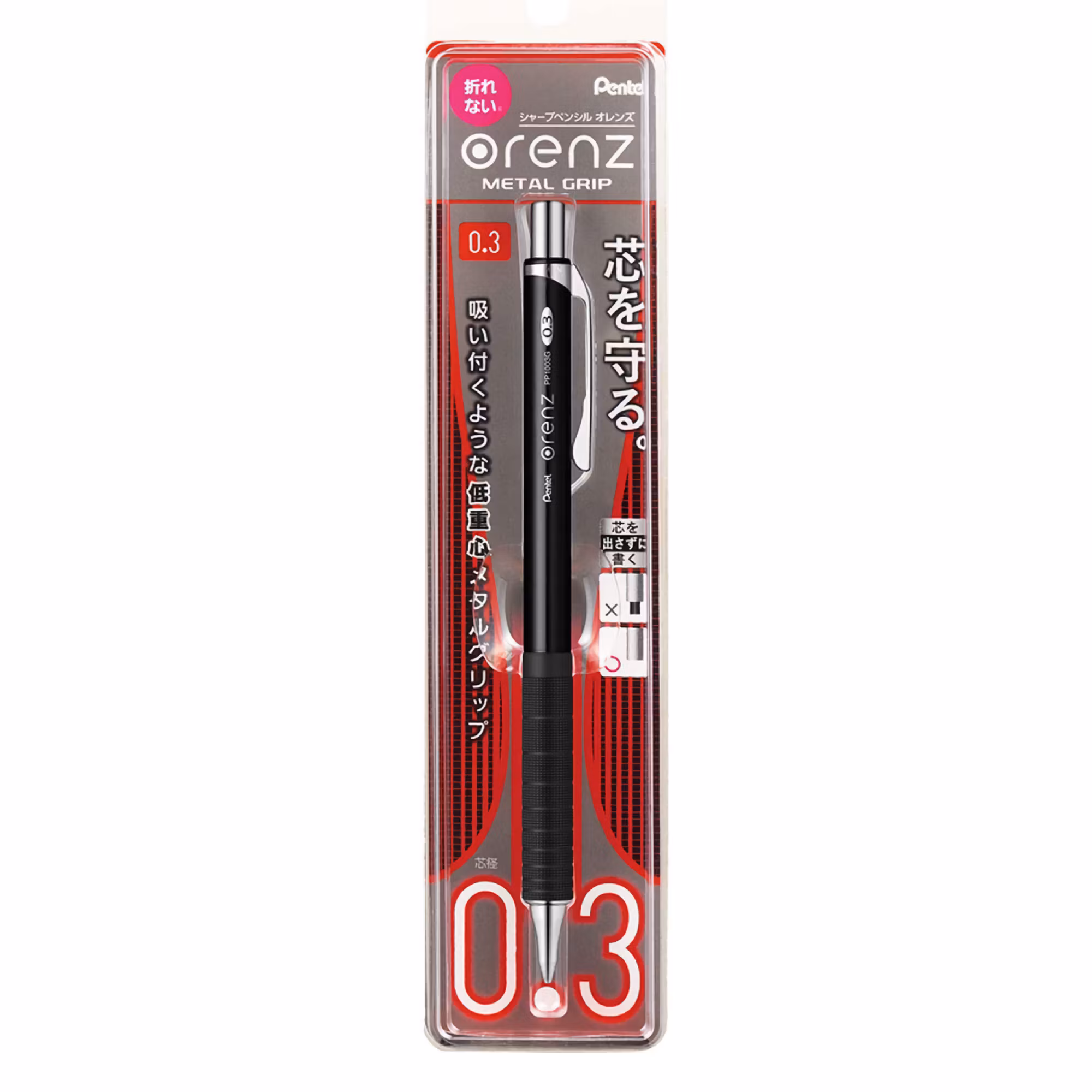 Med Pentel Orenz unika stiftskydd behöver du inte längre vara rädd för att stiftet ska gå av. Det inbyggda röret skyddar nämligen stiftet ända ut till pappret, och dess avrundade hörn gör att skyddet inte kommer i vägen och skrapar i när du skriver. I takt med att stiftet förbrukas följer skyddet med upp mot pennkroppen. När du använt klart pennan går det att trycka in hela stödröret i pennan. Pentel Orenz Metal Grip har en låg tyngdpunkt, vilket innebär en stabil och bekväm skrivupplevelse.