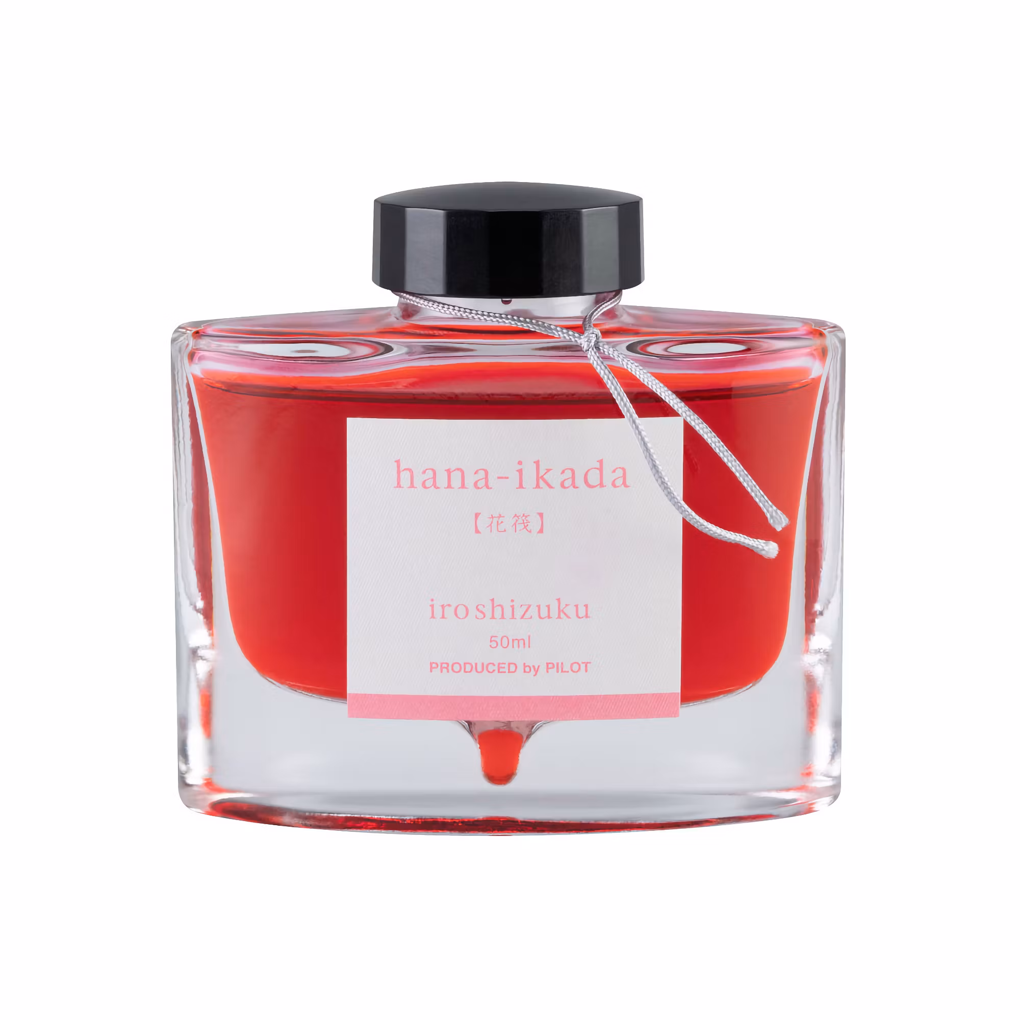 Hana-ikada, som på japanska bokstavligen betyder blomsterflotte, är ett härligt ljusrosa bläck, inspirerat av körsbärsblommor som flyter ovanpå en flod. Flaskan har en nedsänkning i mitten vilket gör att du kan suga upp det till sista droppen.