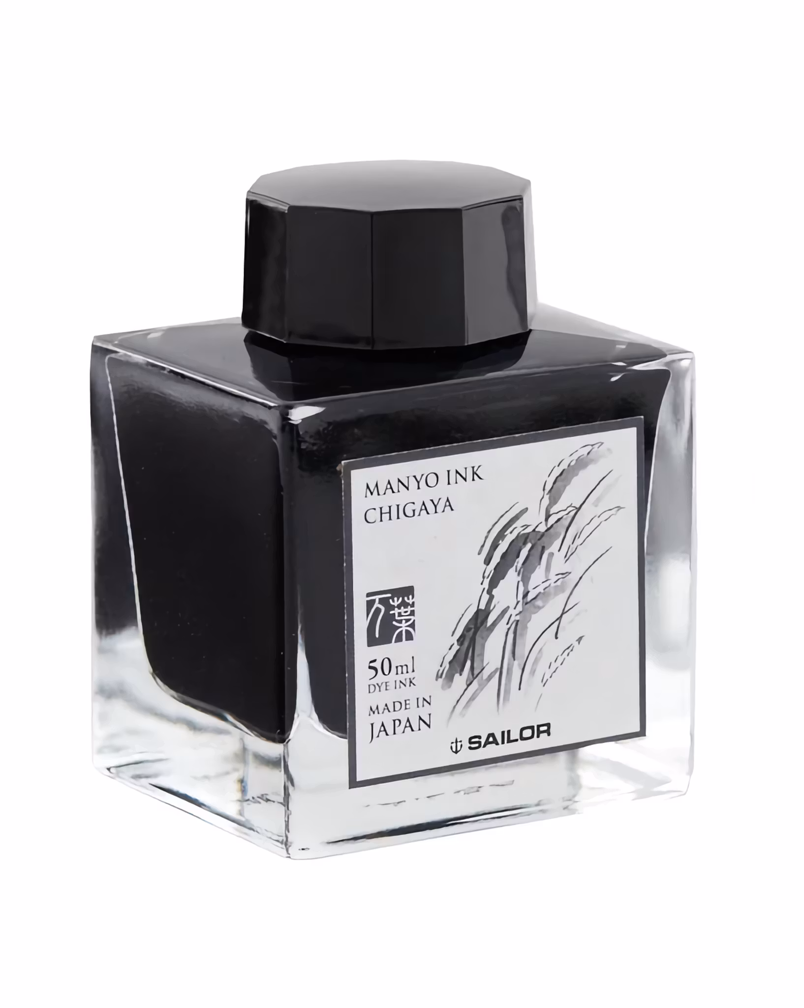 Chigaya är ett svart bläck i Sailors Manyo-serie. Detta jämnt flödande och vattenbaserade bläck kommer i en 50 ml-flaska och passar till alla typer av reservoarpennor. Finns också i flera andra färger.