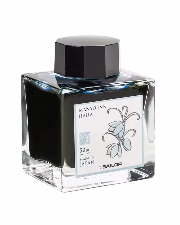 Haha är en blå pastellartad färg i Sailors Manyo-serie. Detta jämnt flödande och vattenbaserade bläck kommer i en 50 ml-flaska och passar till alla typer av reservoarpennor. Finns också i flera andra färger.