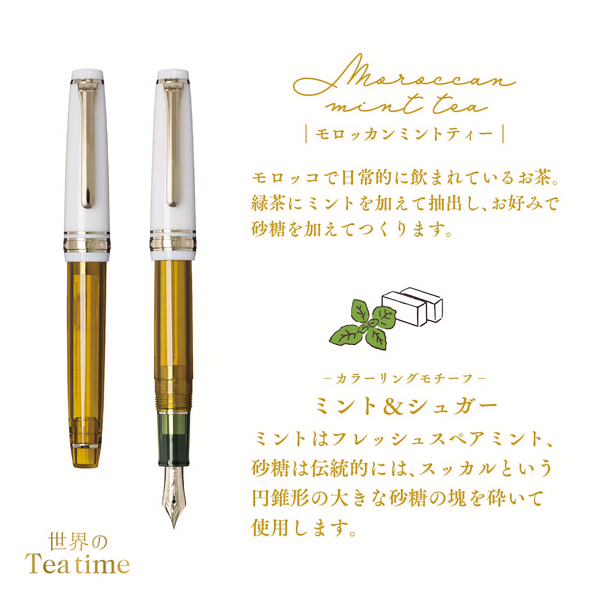 Nu är det äntligen dags för en ny penna i Sailors Tea Time-serie, som hämtar inspiration från olika testundstraditioner runt om i världen. Den här gången hämtar de inspiration från Marocko, som är kända för sitt speciella mynta-te. Mint & Sugar är inspirerad av den fräscha och aromatiska pepparmyntan och det underbart söta sockret som används vid tillagningen av marockanskt mynta-te.