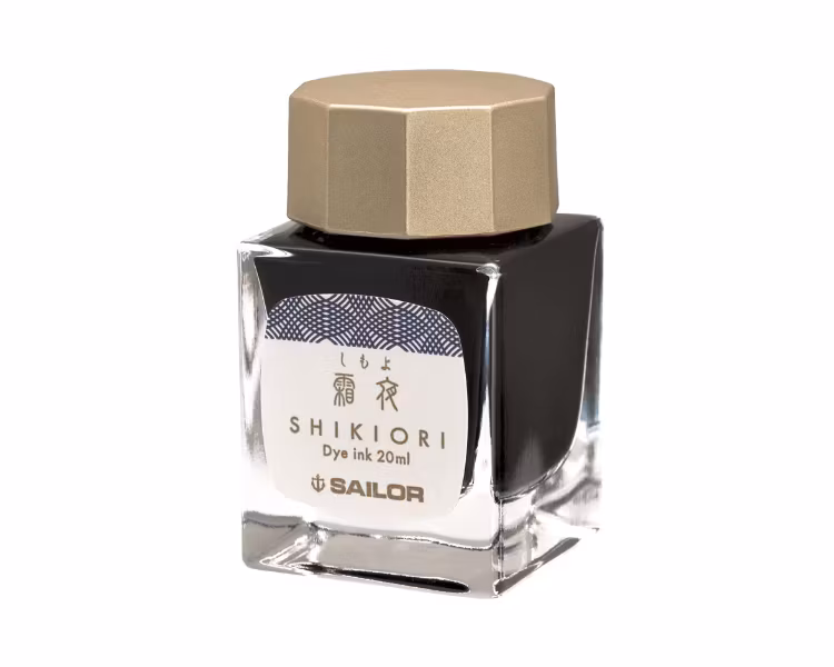 Sailors Shikiori (japanska för ”fyra säsonger”) är en serie bläck med livliga och unika färger inspirerade av skönheten hos de japanska årstiderna. Säker att använda i alla typer av reservoarpennor. Shimoyo, som på japanska betyder frostig natt, är ett mörkblått bläck med inslag av svart.