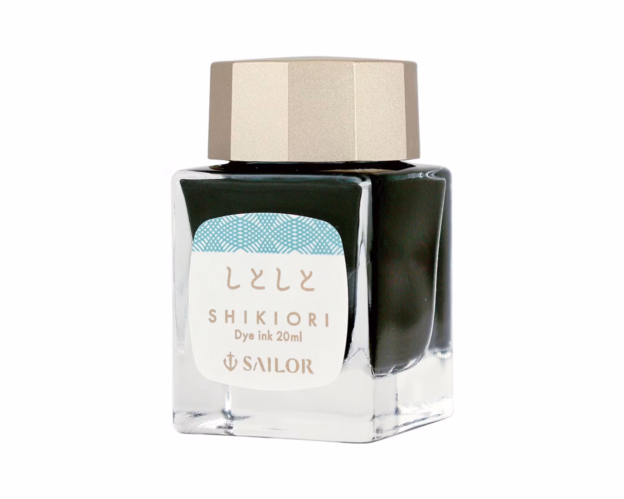 Sailors Shikiori (japanska för ”fyra säsonger”) är en serie bläck med livliga och unika färger inspirerade av skönheten hos de japanska årstiderna. Säker att använda i alla typer av reservoarpennor. Shitoshito, som betyder "tyst och stilla" har en ljusturkos nyans. Vattenbaserad. Finns också i flera andra färger.