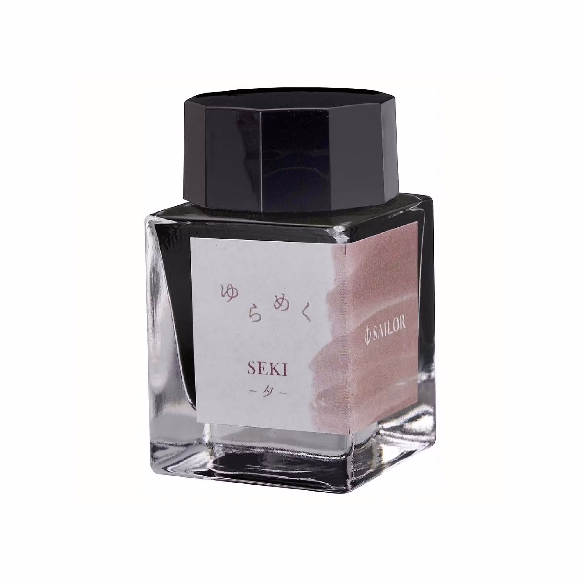 Sailor Yurameku Seki är en del av Sailors bläckkollektion Yurameku för reservoarpennor. Hela serien kännetecknas av mjuka, dämpade färger med skuggningsegenskaper inspirerade av himlen. Färgskiftningarna i Yurameku-serien varierar beroende på tid och typ av papper. Seki är ett bläck som rör sig mellan grått, grönt och rosa. Vattenbaserad. Finns också i flera andra färger.