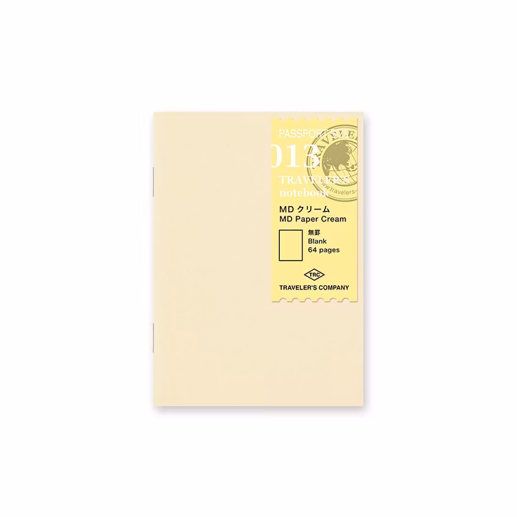 En blank refill med krämfärgat papper i passport-storlek till något av Traveler’s notebooks läderfodral i samma storlek.