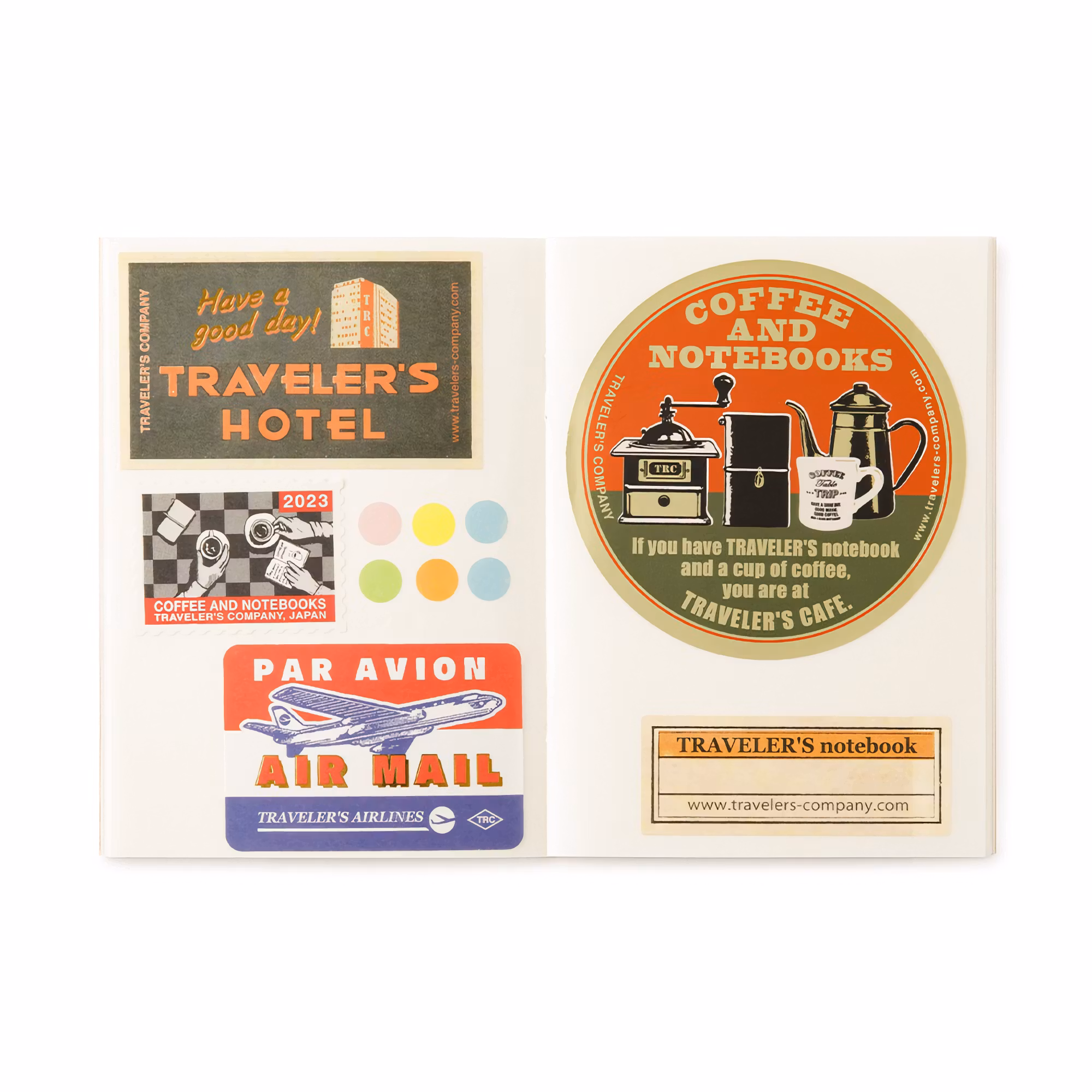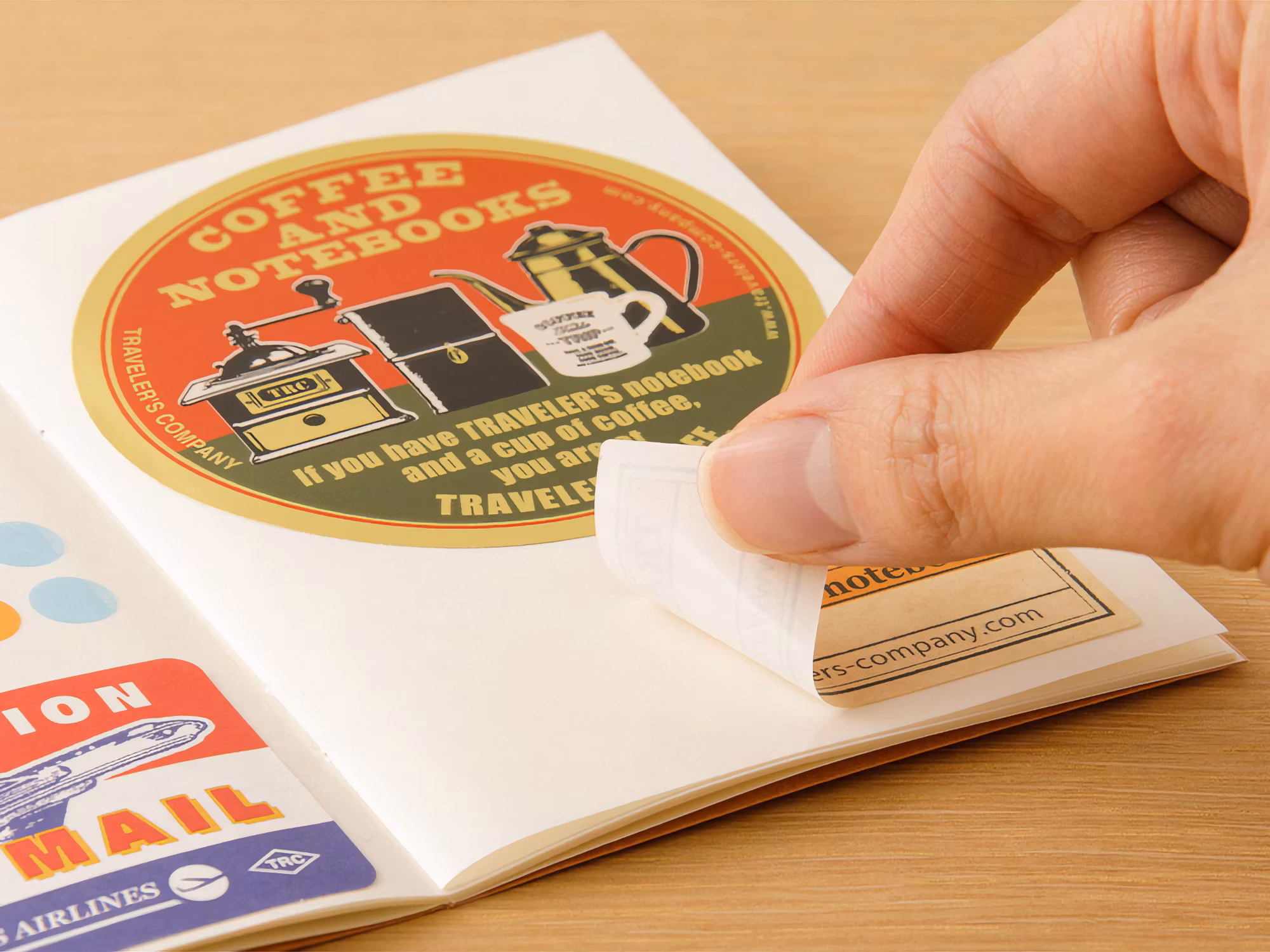 Klistermärkespapper i passport-storlek till något av Traveler’s notebooks läderfodral i samma storlek.
