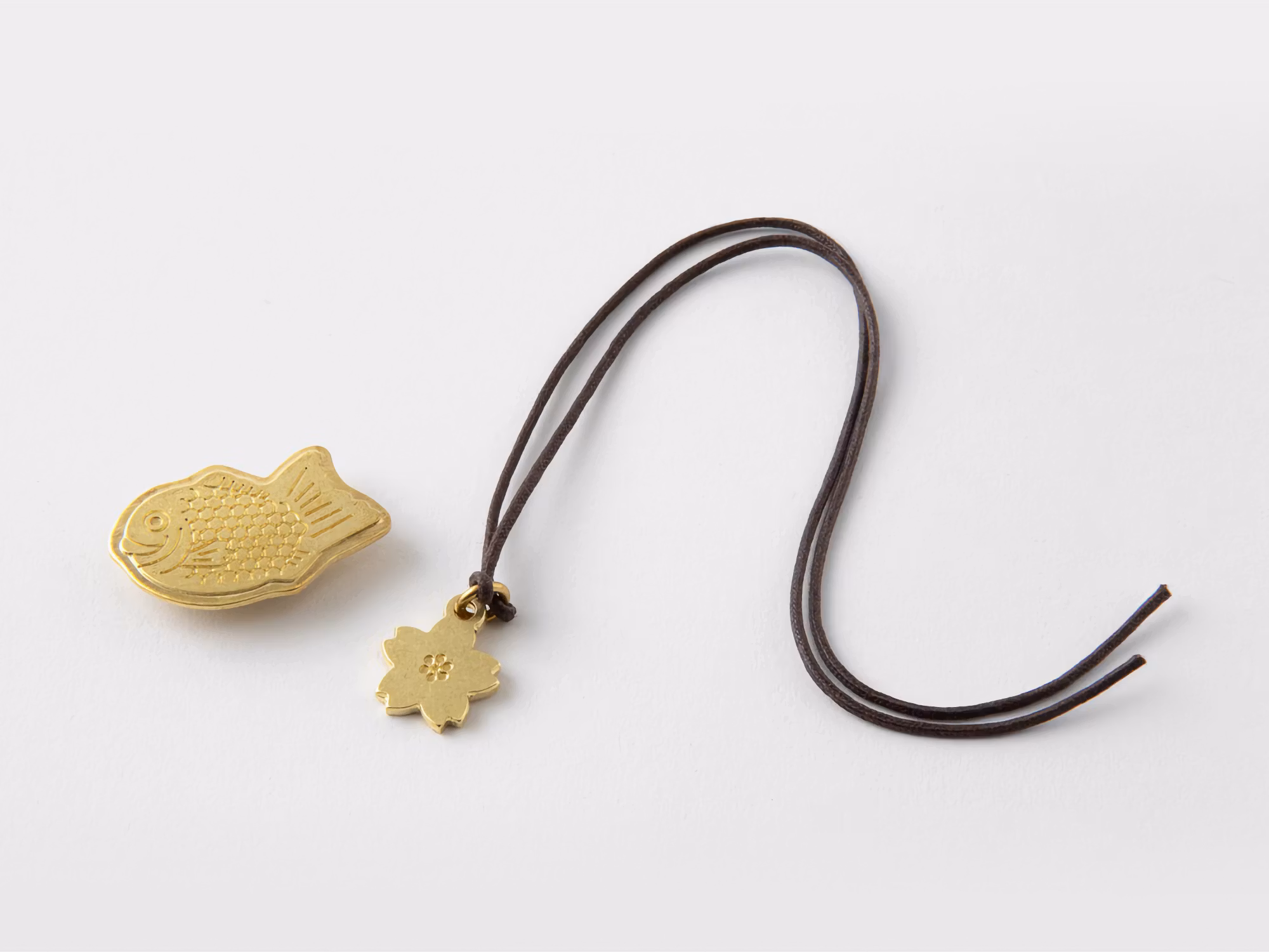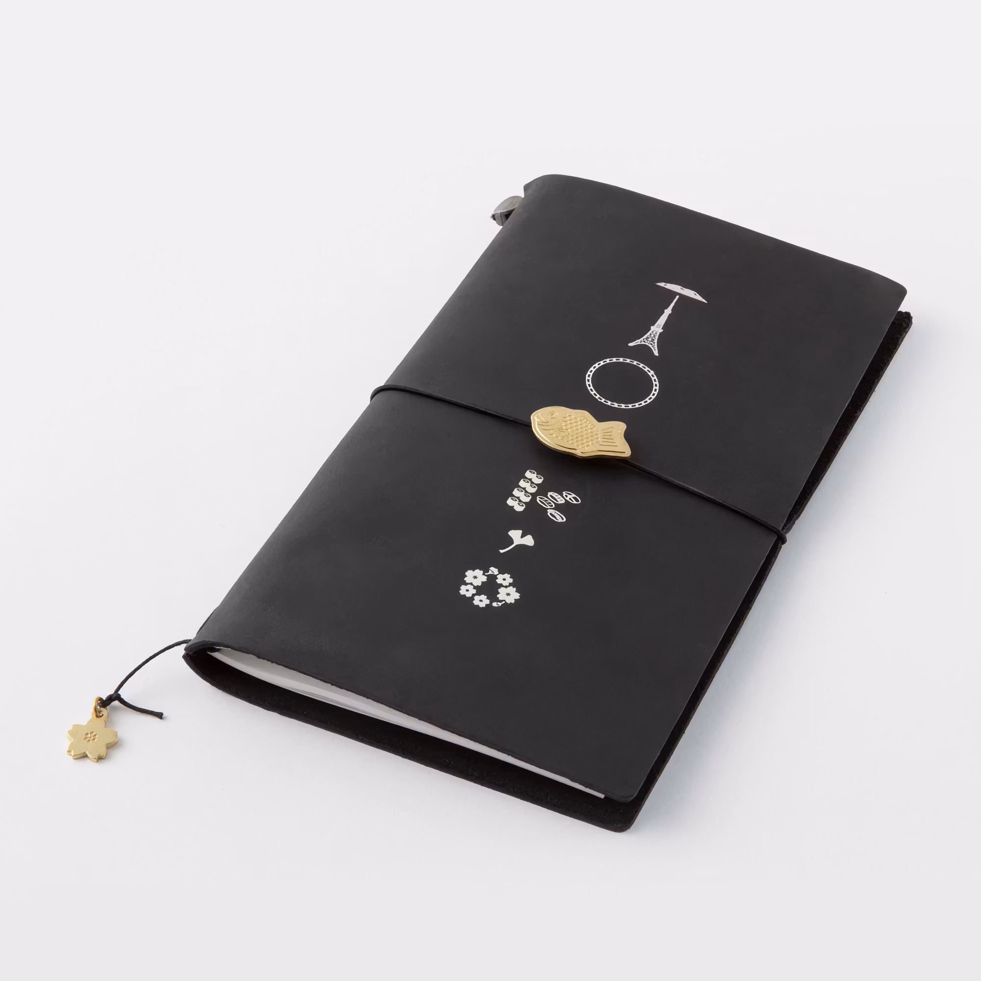 Den här mässingsamuletten visar en så kallad taiyaki, ett klassiskt Tokyo-snacks, liksom en körsbärsblomma, som blommar på olika platser i Tokyo på våren. Taiyaki-amuletten kan fästas på det elastiska bandet runt Travelers's notebooks läderomslag så att den kan åka fram och tillbaka. Körsbärsbloms-amuletten kan fästas på bokmärket.
