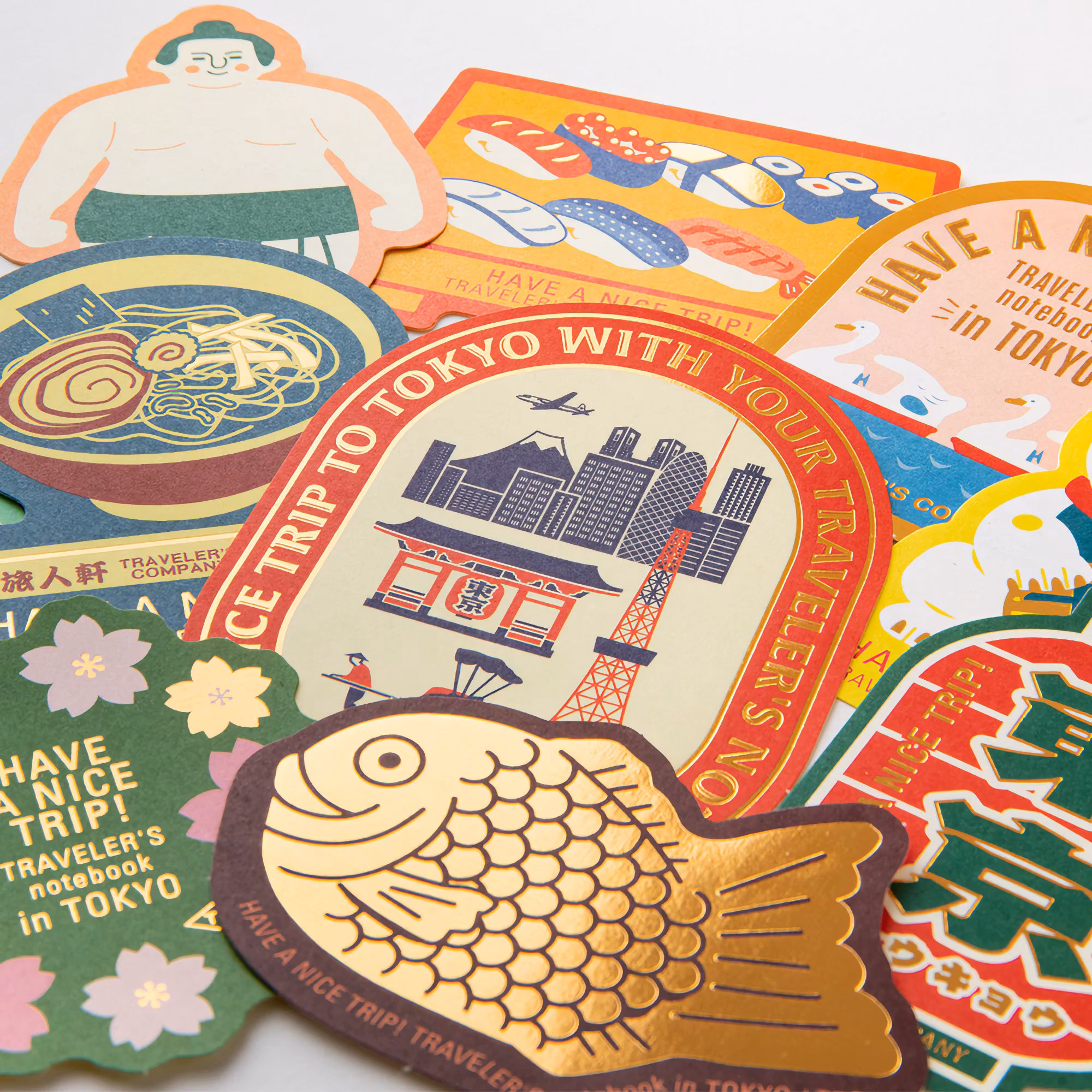 10 klistermärken vars motiv är stark förknippade med Tokyo, inklusive en lockande katt (som sägs ha fötts ur Edos handelskultur), en sumobrottare från Edoperioden, sushi (också edostil), Tokyo-ramen, cream soda och mer.