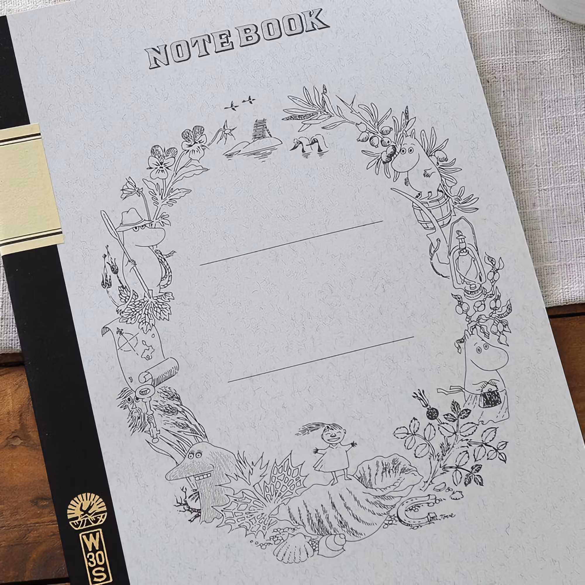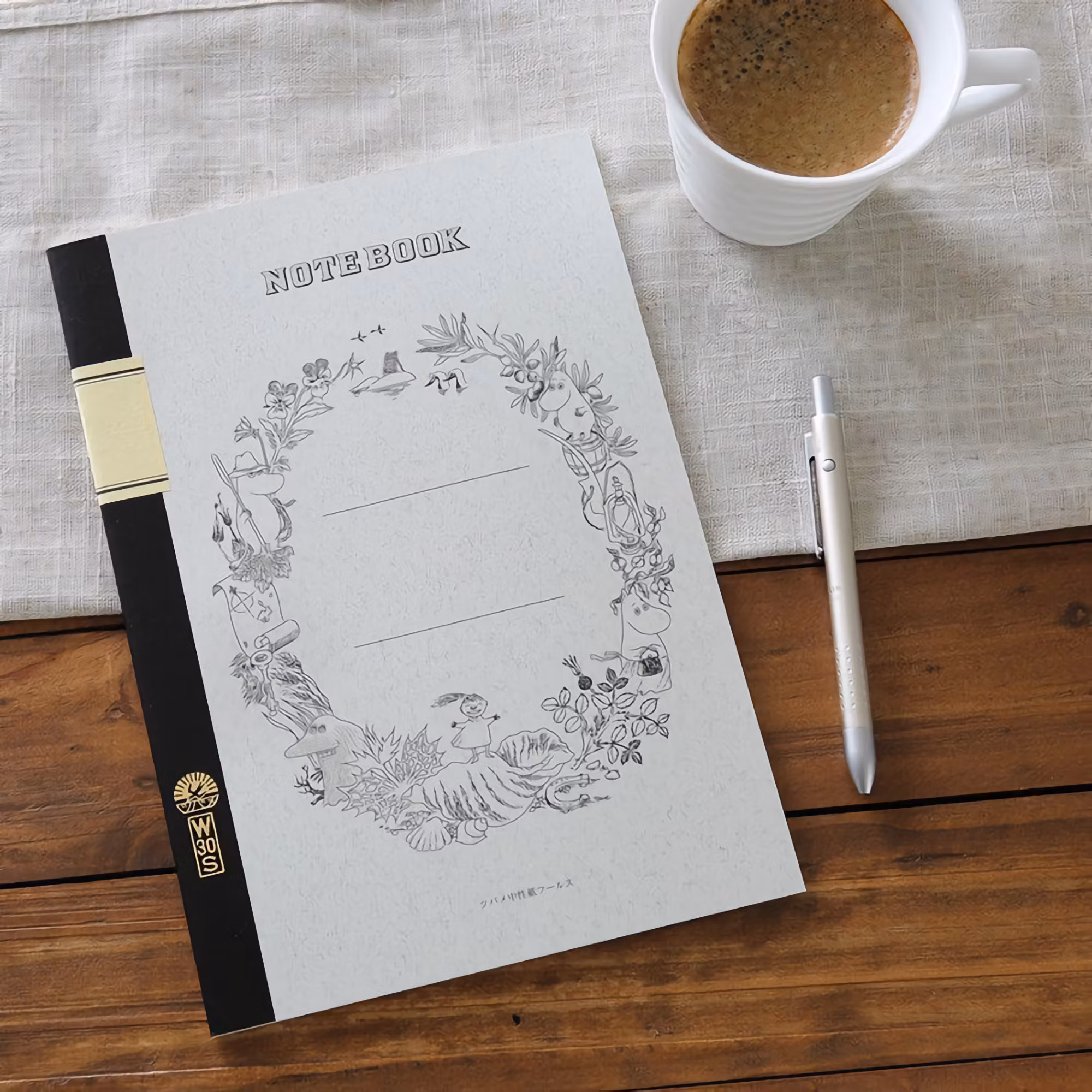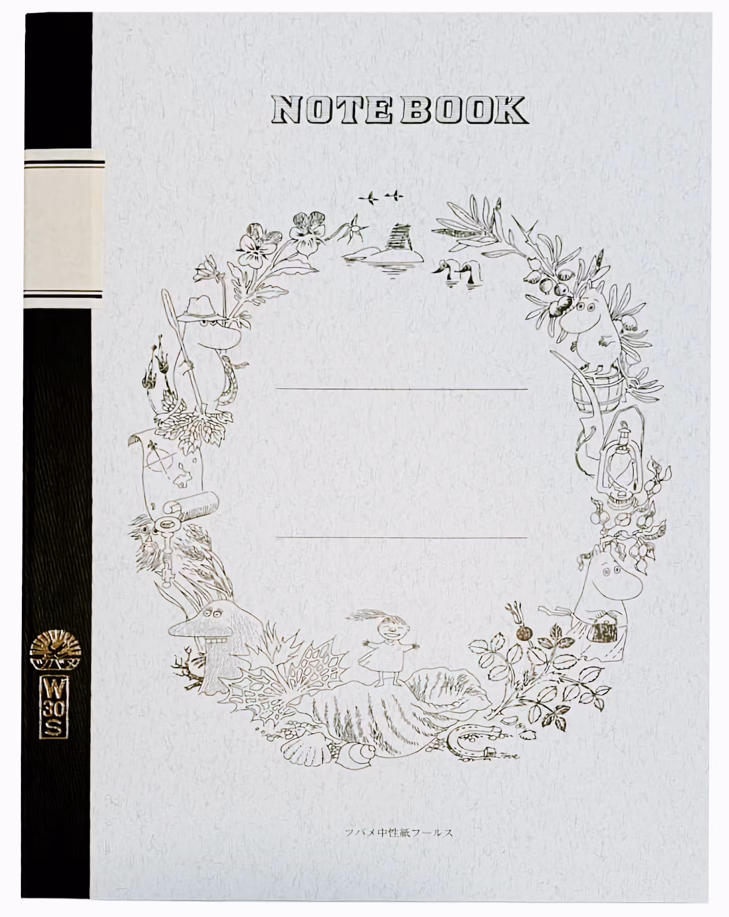 Tsubames klassiska anteckningsbok med vackert muminmönster på framsidan. Anteckningsboken är i så kallat foolscap-utförande, och innehåller mycket fint japanskt papper – perfekt till förslagsvis reservoarpennor.