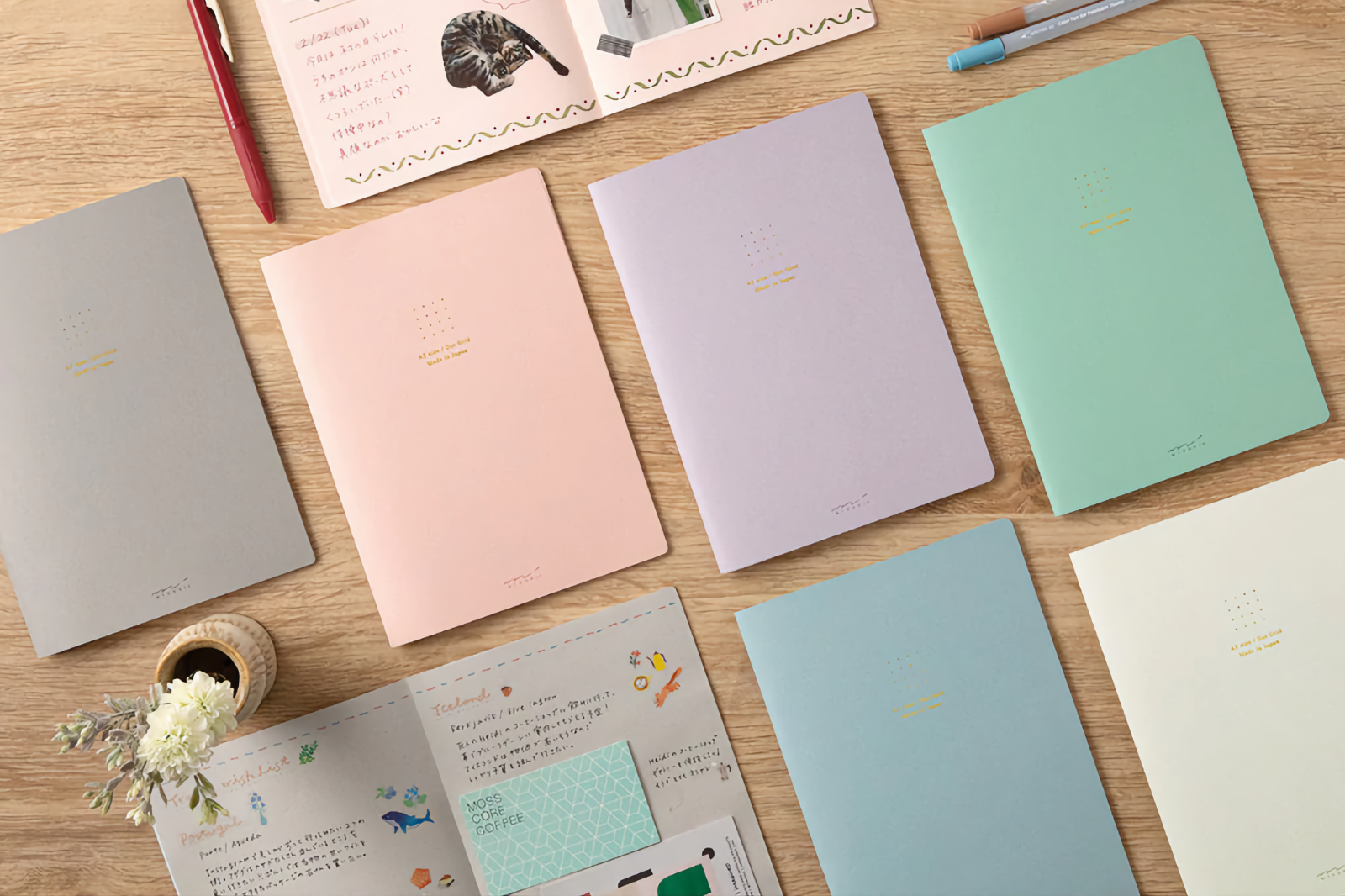 Midoris nya färgglada anteckningsböcker är både smidiga och lekfulla. Pappret lämpar sig väl för bland annat reservoarpennor, och har samma blå nyans både utvändigt som inuti, vilket gör det roligare att hitta rätt kombination av papper och bläck. Sidorna har ett praktiskt dot grid-utförande.