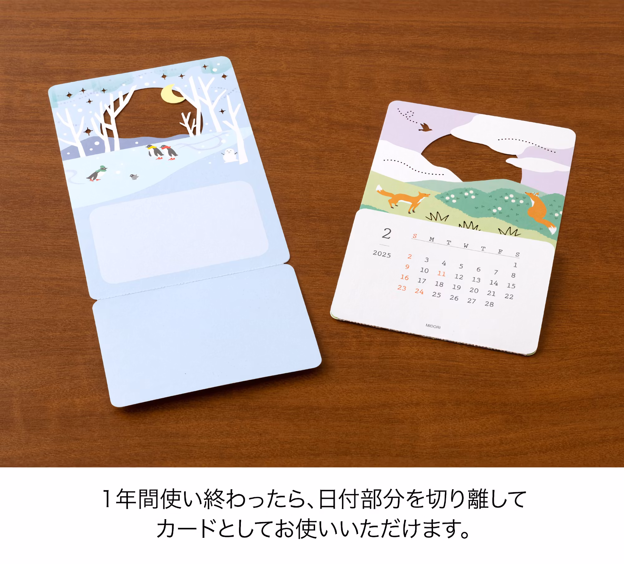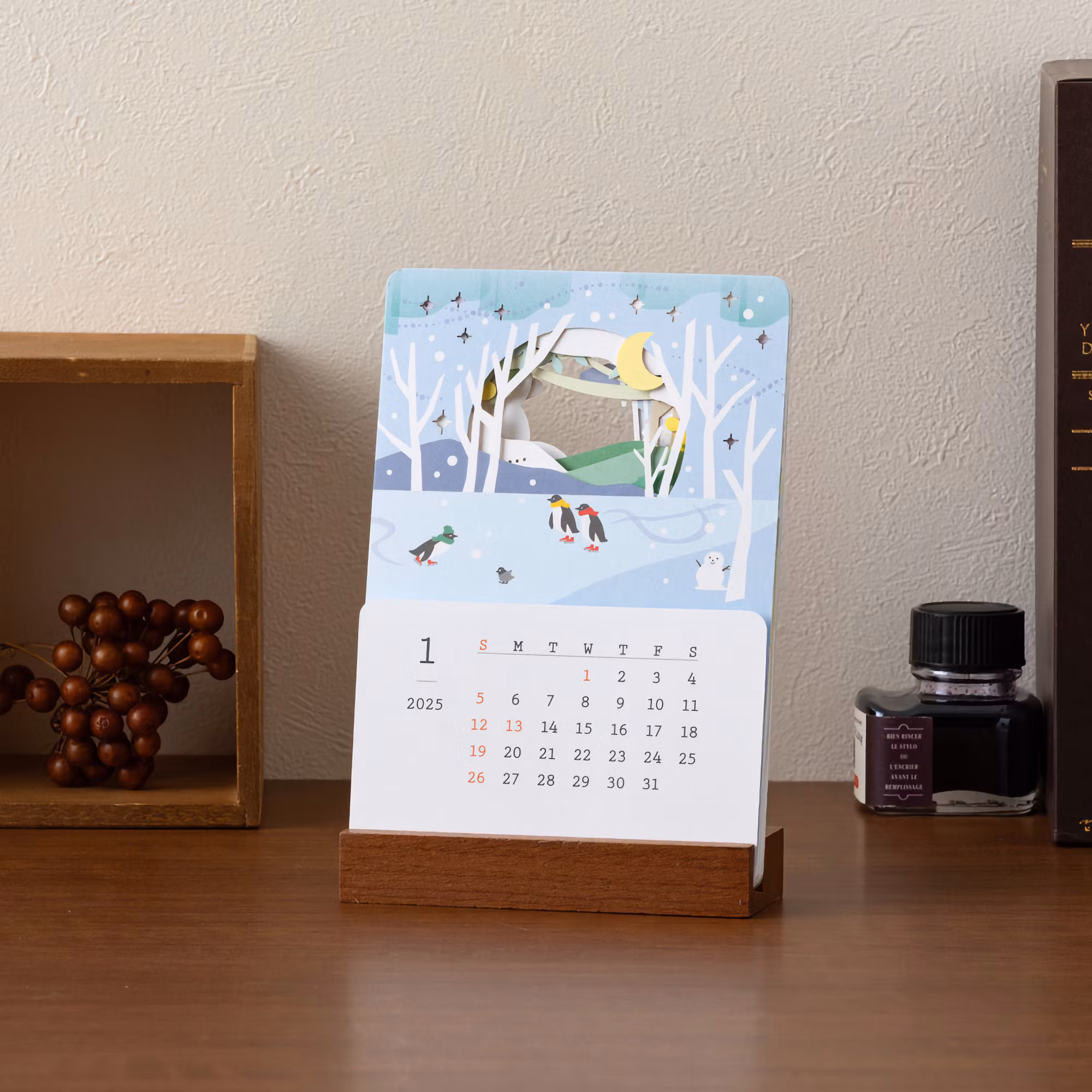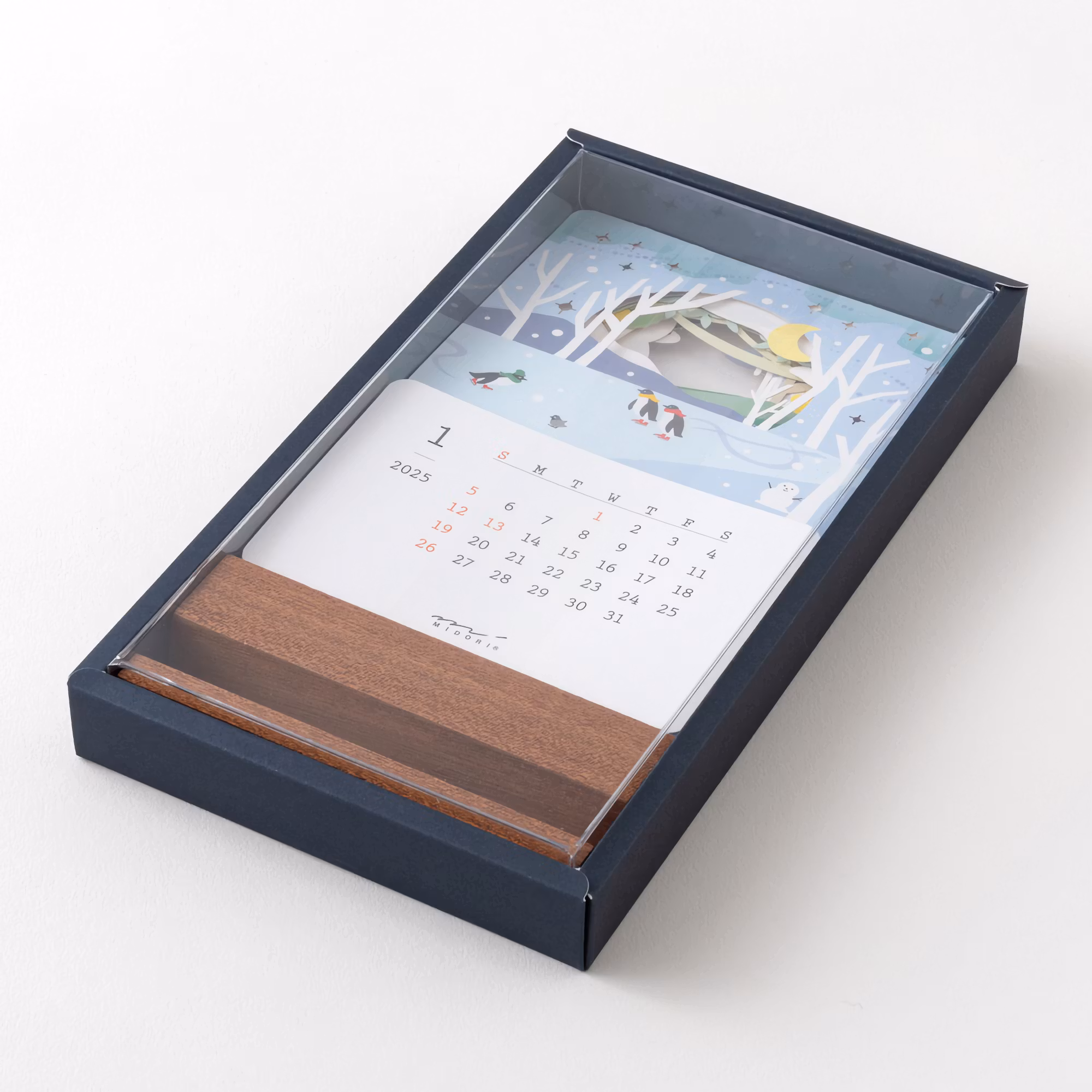 Midoris Calendar Laser Processing är en tunn bordskalender som kan placeras exempelvis på köksbänken eller på ditt skrivbord utan att ta upp mycket plats. Varje månads motiv är fint utskuret med laser, och varje gång du vänder blad förändras det utskurna mönstret. Dessutom kan du – efter att ha använt kalendern i ett år – riva av datumdelen och använda varje kort som ett slags presentkort.