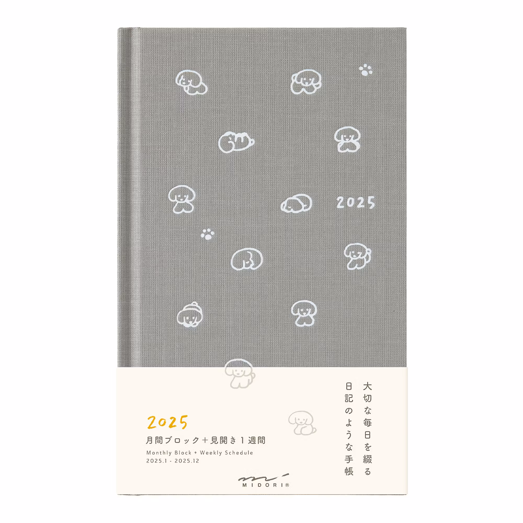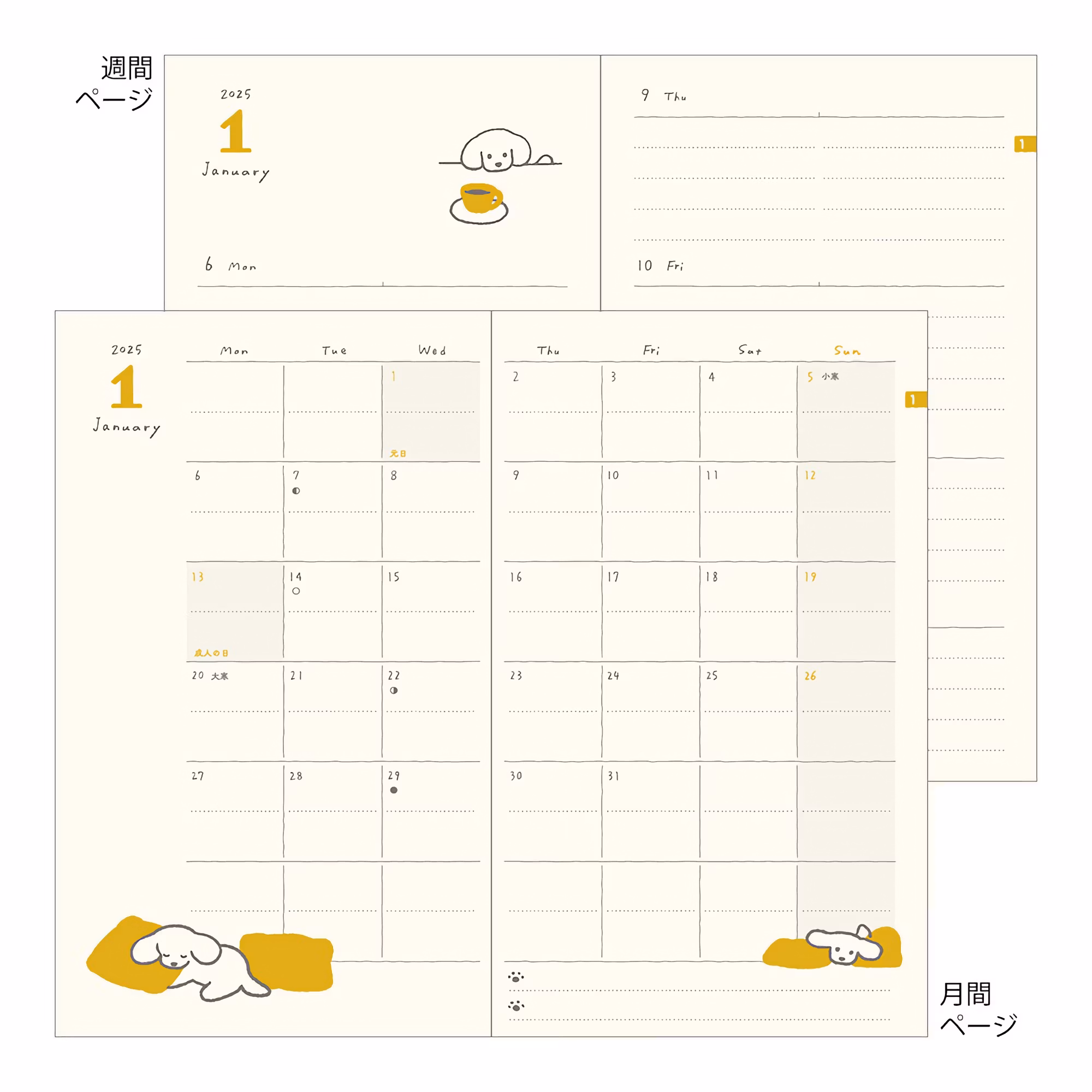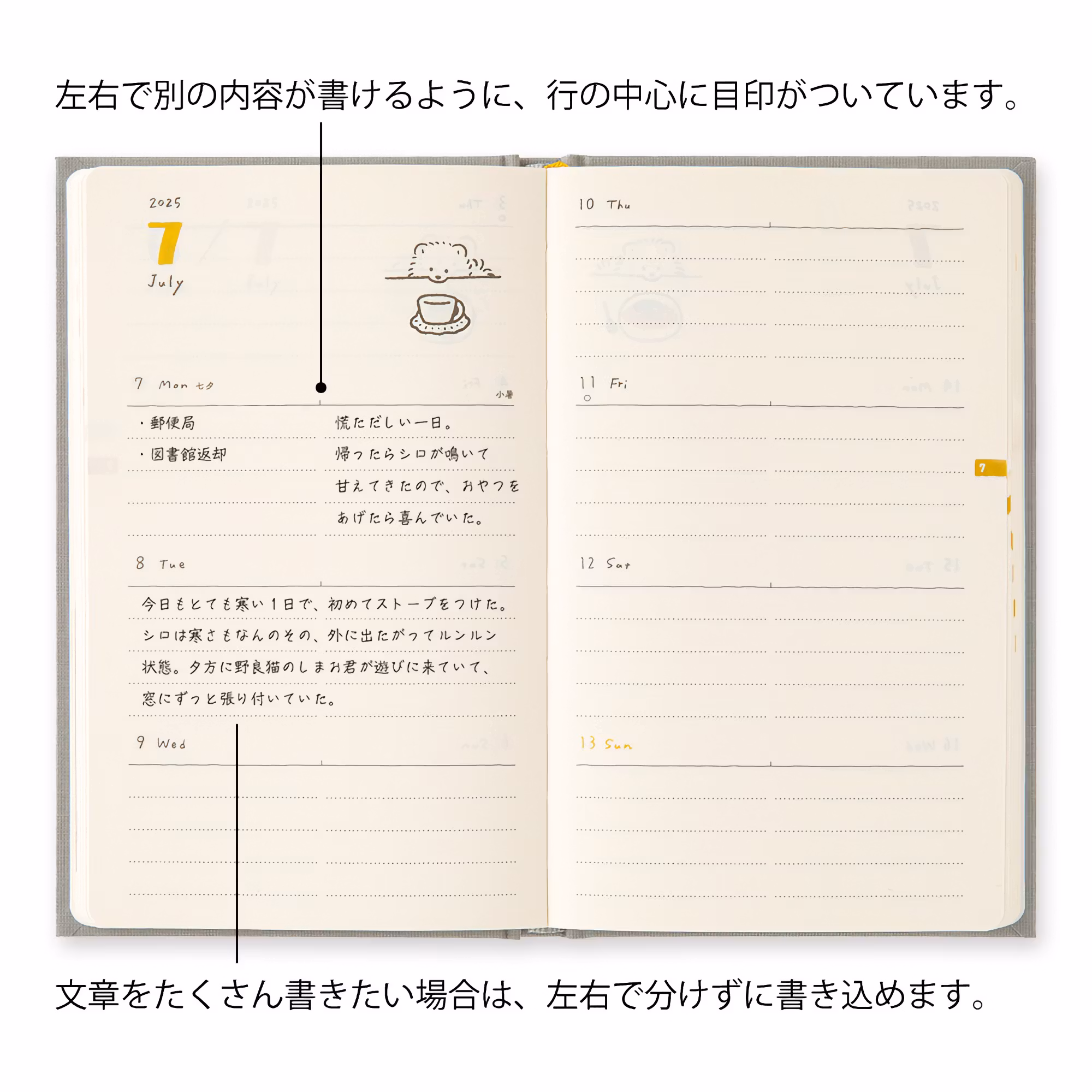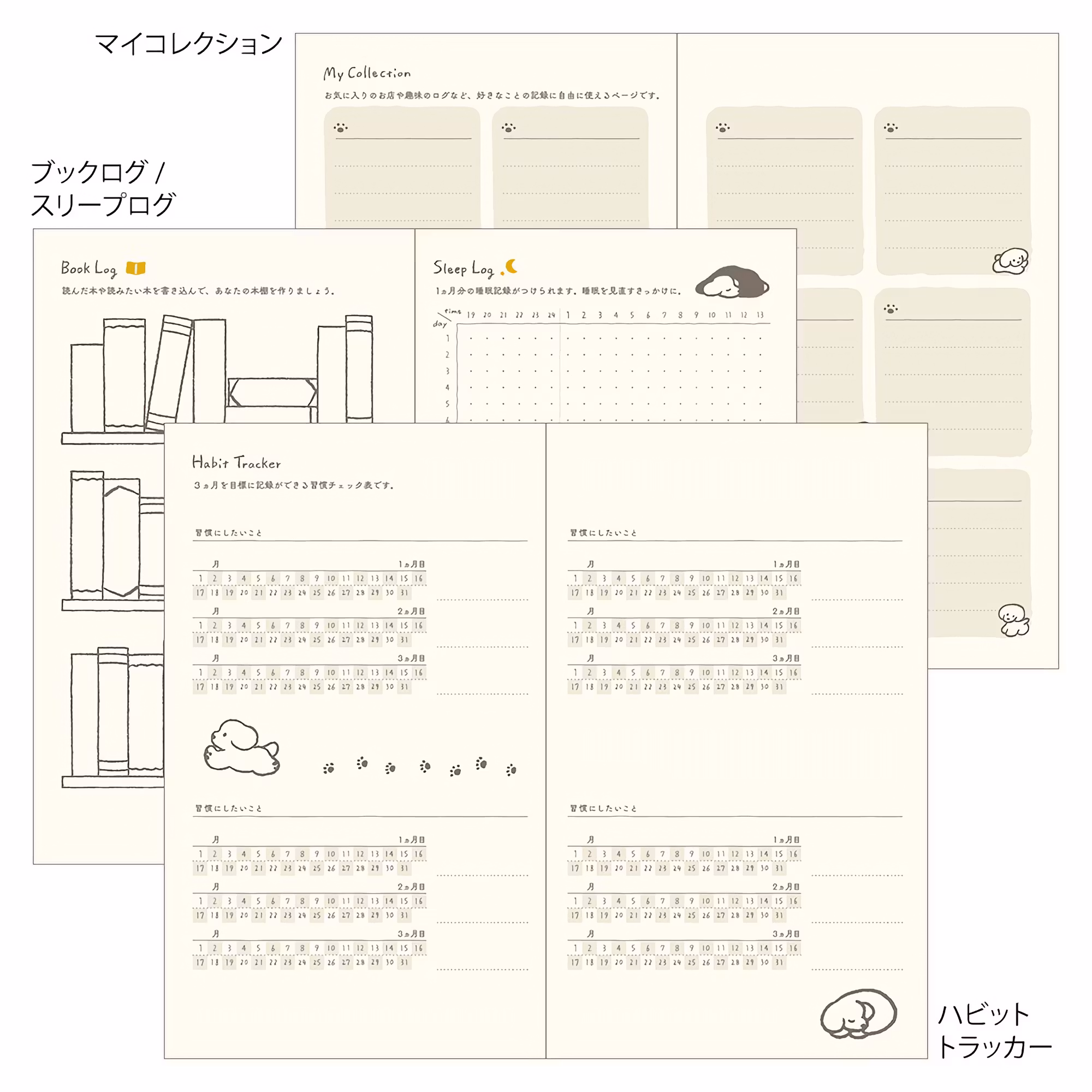 Varje sida har fina illustrationer av illustratören Tetsumi Kana. Boken innehåller en månadssida där du kan se en månad i taget, en veckosida med gott om plats för att skriva, samt extra sidor för att hålla koll på anteckningar. Den sydda bindningen gör att boken kan öppnas platt, 180 grader, vilket gör det enkelt att skriva överallt. Omslaget har ett bokliknande tygomslag och pryds med foliestämpling. Den har också ett bokmärkesband för att du enkelt ska kunna hitta den senaste sidan du skrev på.