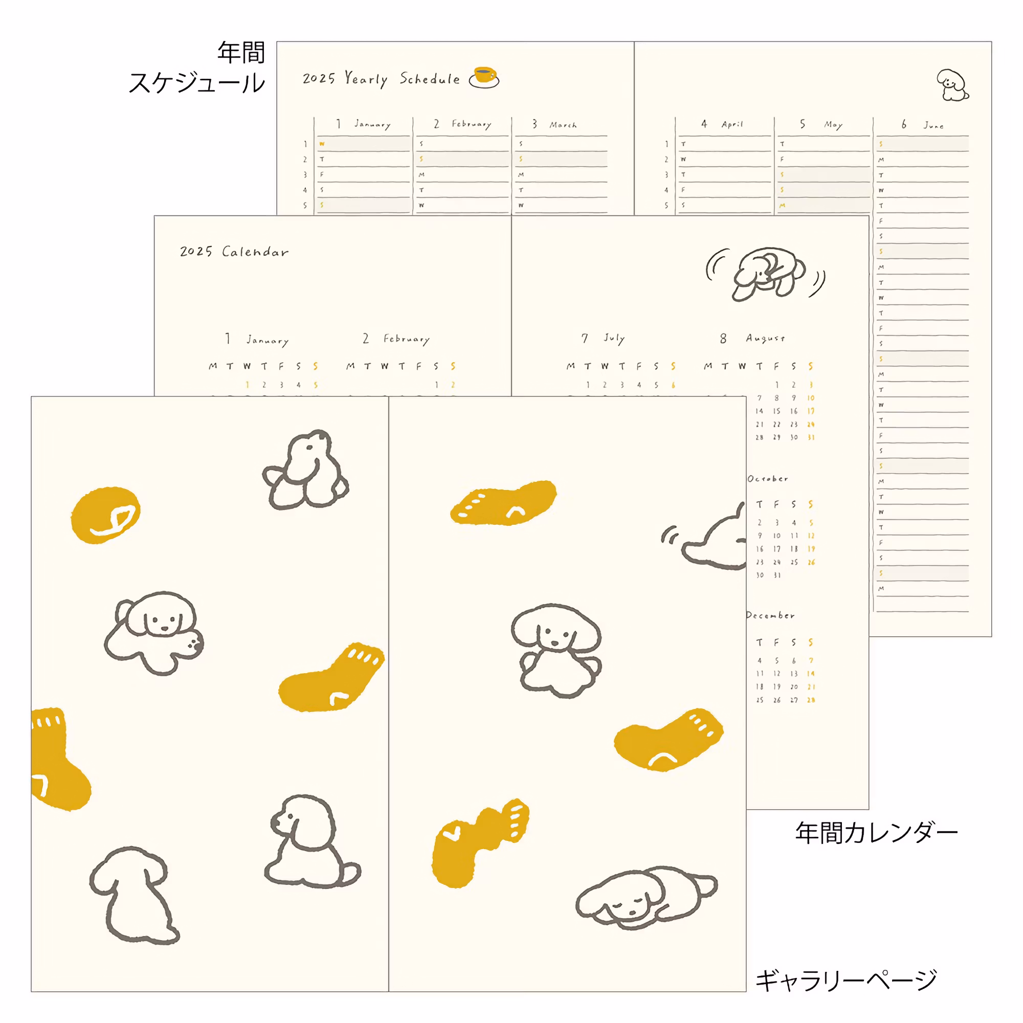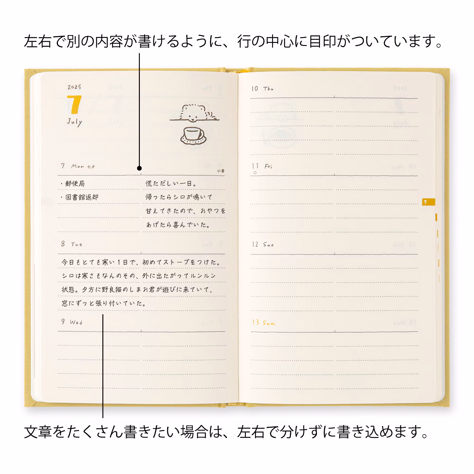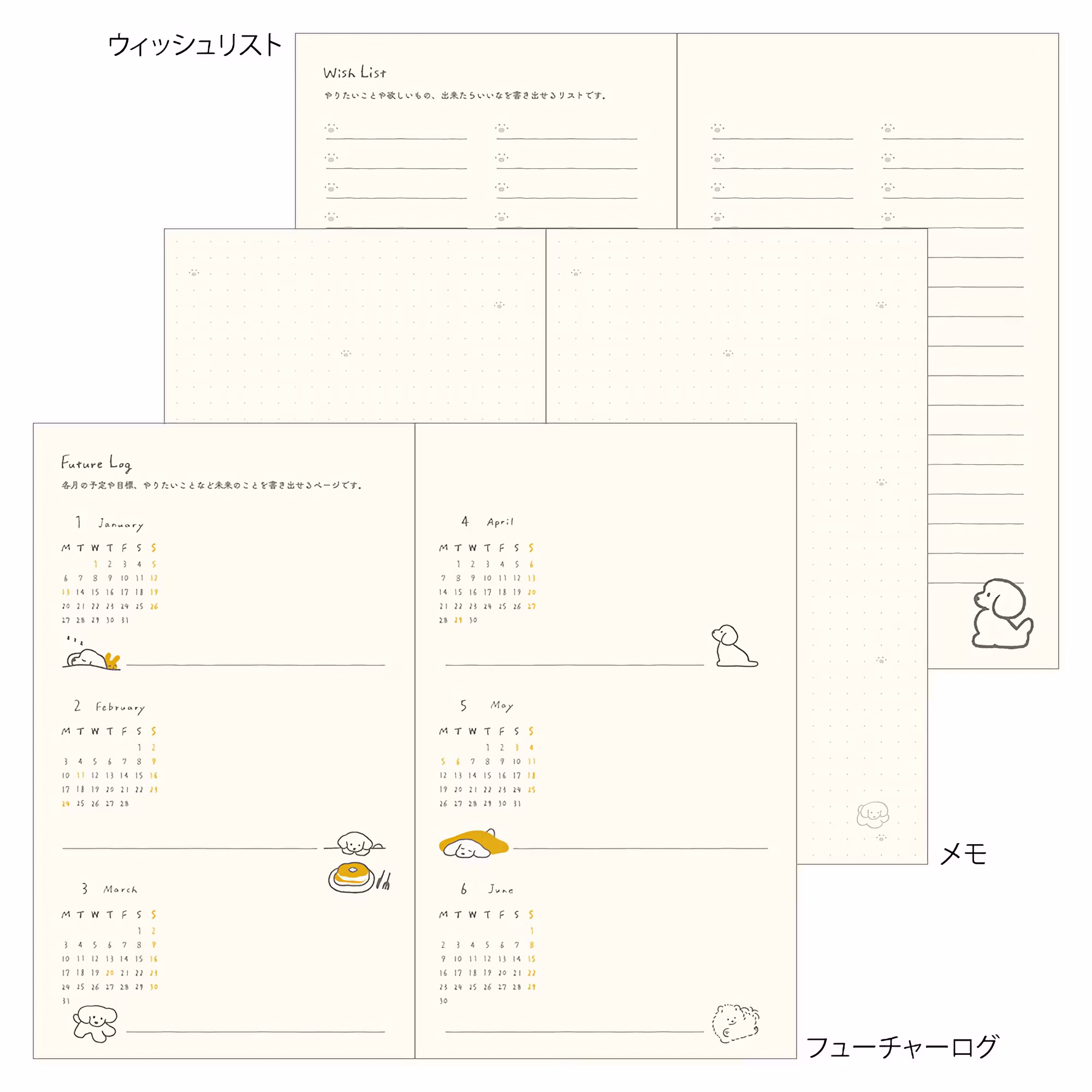 Varje sida har fina illustrationer av illustratören Tetsumi Kana. Boken innehåller en månadssida där du kan se en månad i taget, en veckosida med gott om plats för att skriva, samt extra sidor för att hålla koll på anteckningar. Den sydda bindningen gör att boken kan öppnas platt, 180 grader, vilket gör det enkelt att skriva överallt. Omslaget har ett bokliknande tygomslag och pryds med foliestämpling. Den har också ett bokmärkesband för att du enkelt ska kunna hitta den senaste sidan du skrev på.